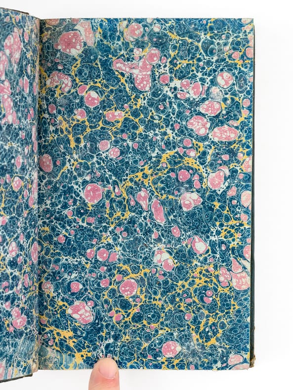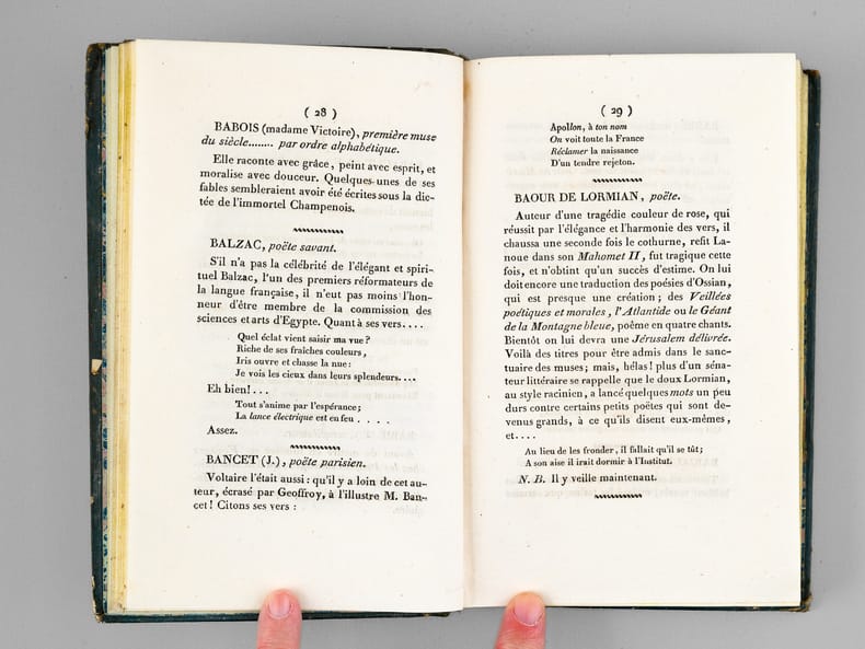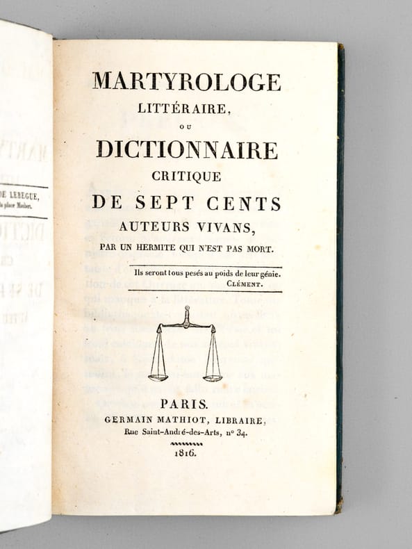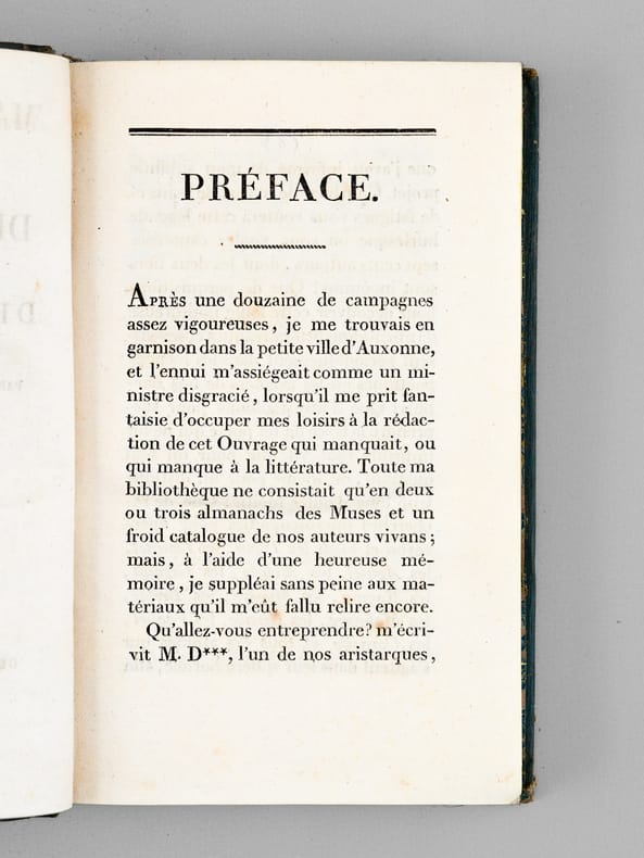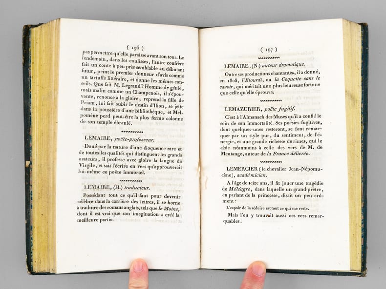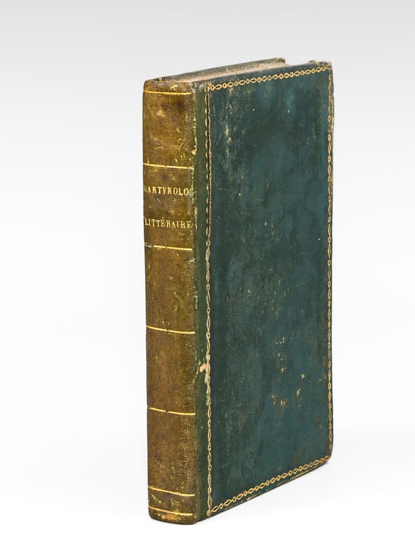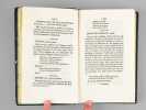 Paris, Germain Mathiot, 1816. "13 x 20, 349 pp., reliure dos cuir orné de fleurons et décor à la roulette, tranches mouchetées, état moyen (reliure dos fort abîmée; mors fendus et manque de cuir à la coiffe)."