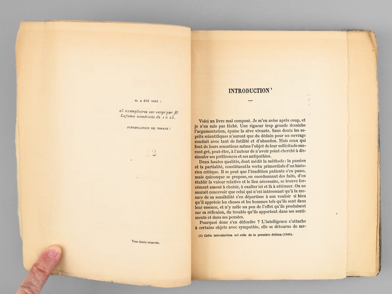 Un des 25 exemplaires sur vergé pur fil Lafuma numérotés (n° 12), nouvelle édition revue et complétée, 1 vol. in-12 br., Mercure de France, Paris, 1922, 348 pp.