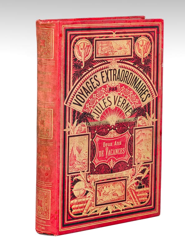 Première édition in-8 illustrée de 92 illustrations de Benett dont une carte hors-texte en couleurs : il s'agit de la première apparition de la polychromie pour une illustration d'un roman de Jules Verne. Cartonnage éditeur Hetzel "au deux éléphants" en pleine percaline rouge signé Lenègre de type 3, premier plat signé Souze, second plat de type Lenègre "e" comme indiqué par Jauzac, dos au phare, pages de garde bleues d'origines, toutes tranches dorées. Catalogue EL in-fine. Les mors et les coiffes de notre exemplaires ont été reteintés. Un coin et un mors en queue légèrement émoussés. Deux ans de vacancesest une robinsonnade mettant en scène quatorze collégiens de Nouvelle Zélande. - Photographies et détails sur www.Edition-Originale.com -