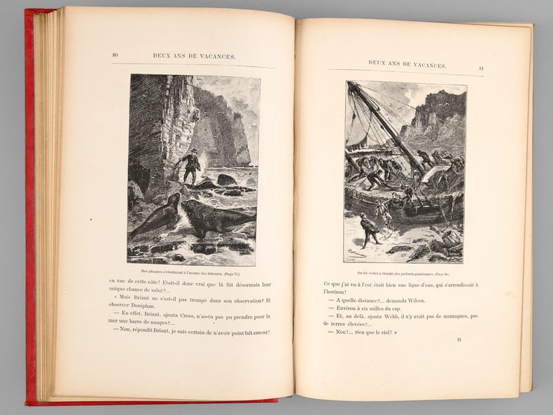 Première édition in-8 illustrée de 92 illustrations de Benett dont une carte hors-texte en couleurs : il s'agit de la première apparition de la polychromie pour une illustration d'un roman de Jules Verne. Cartonnage éditeur Hetzel "au deux éléphants" en pleine percaline rouge signé Lenègre de type 3, premier plat signé Souze, second plat de type Lenègre "e" comme indiqué par Jauzac, dos au phare, pages de garde bleues d'origines, toutes tranches dorées. Catalogue EL in-fine. Quelques très infimes traces blanchâtres sur le dos et le second plat et deux infimes accrocs en tête du premier plat et miors de tête du second. Rousseurs éparses essentiellement en début et fin de volume, comme habituellement. Gardes d'origine d'un bleu intact. Deux ans de vacancesest une robinsonnade mettant en scène quatorze collégiens de Nouvelle Zélande. - Photographies et détails sur www.Edition-Originale.com -