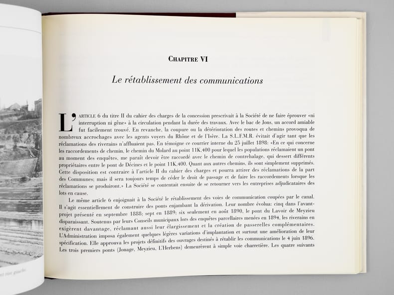 Très bon état. Cet ouvrage retrace, à partir d'un ancien fond photographique incluant 250 plaques Lumière 18x24, la contruction du canal de Jonage par la Société Lyonnaise des Forces motrice du Rhône. Ce canal de 19 km est une dérivation du Rhône, pour alimenter une usine hydro-électrique à Villeurbanne, et pour faciliter la navigation fluviale en amont de Lyon. Ce chantier, qui dura de 1894 à 1899, marqua un changement d'échelle dans l'industrie hydro-électrique française. Le chantier fut qualifié à l'époque de "Panama Lyonnais".