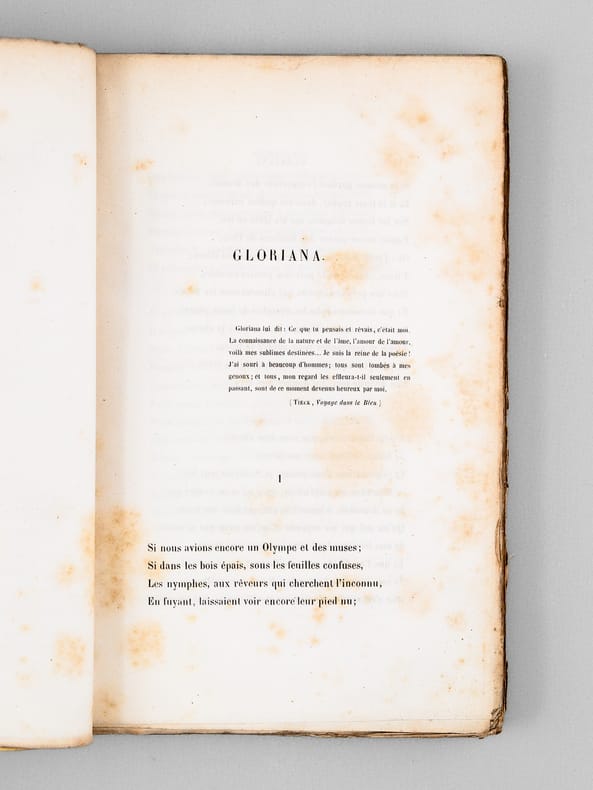 Etat satisfaisant (couv. frottée avc dos rajouté, des rousseurs, bon état par ailleurs) pour ce recueil de poésies, qui fut le tout premier livre de Louis Ulbach. Victor Hugo l'avait encouragé à le publier. Peu courant désormais.