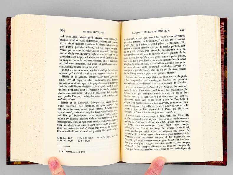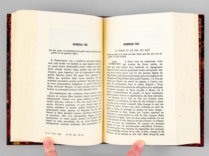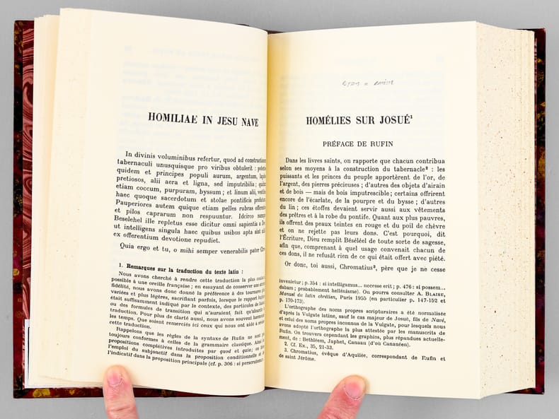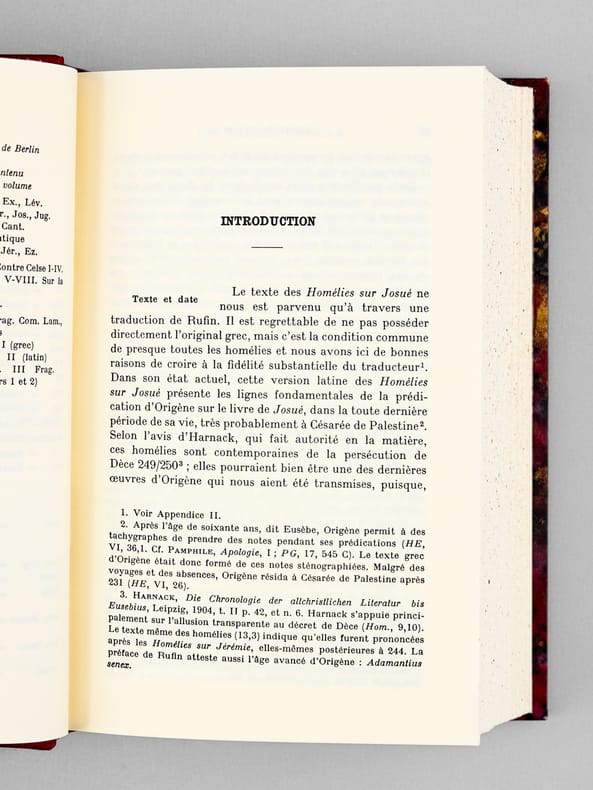 Texte latin de W.A. Baerhens, introduction, traduction et notes par Annie Jaubert, 1 vol. in-12 reliure demi-chagrin rouge, dos à 5 nerfs, couvertures et dos conservés, coll. Sources Chrétiennes, n° 71, Les Editions du Cerf, Paris, 2000, 515 pp. et 6 ff. n. ch.