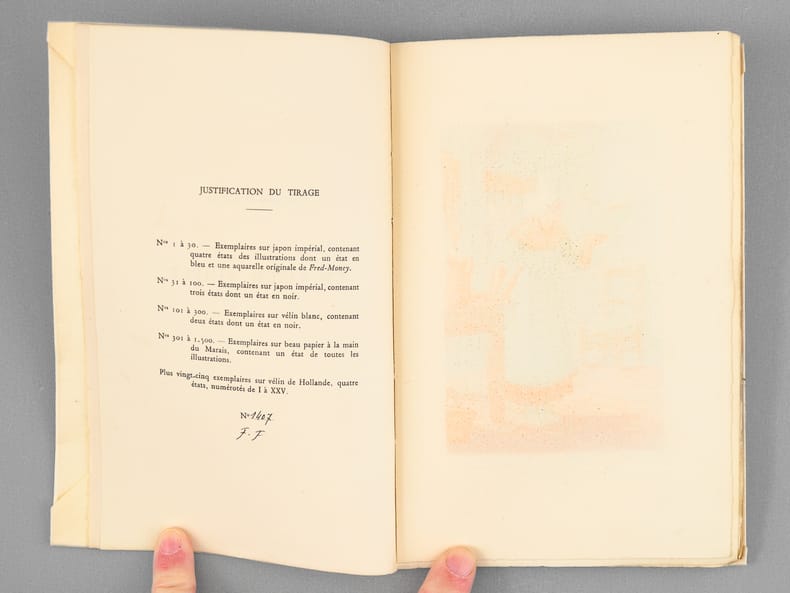 Illustrations en couleurs de Fred-Money, tirage à 1500 exemplaires numérotés (n° 1407), exemplaire sur Marais paraphé par l'éditeur, 1 vol. in-12 br., Librairie des Amateurs, A. Ferroud, F. Ferroud, Paris, 1928, 76 pp. avec planches en couleurs à la poupée