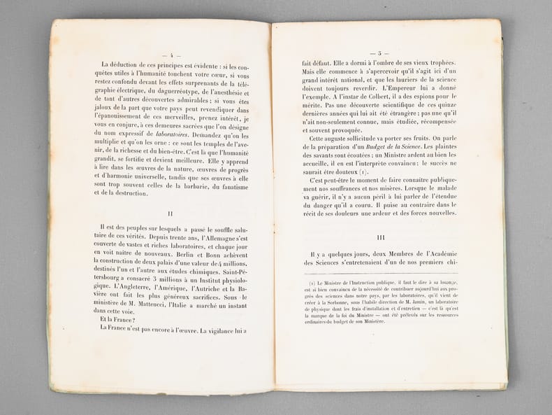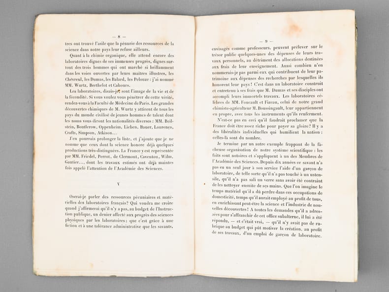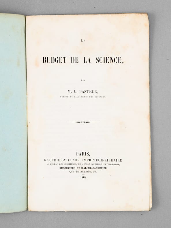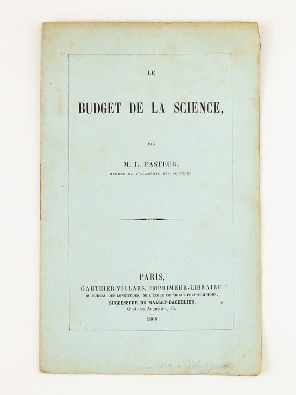 Louis Pasteur fait ici connaître publiquement "les misères et les souffrances" de la recherche en France, en 1868 ! Etat satisfaisant (mouill. lég. colorée en fin de brochure). Prix en l'état