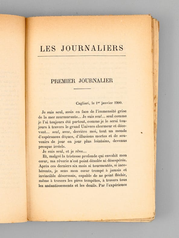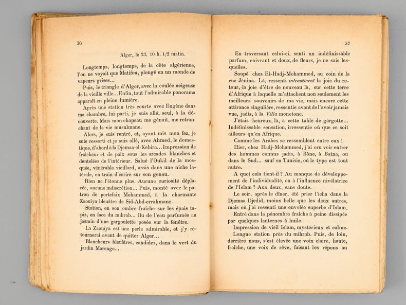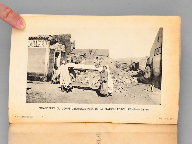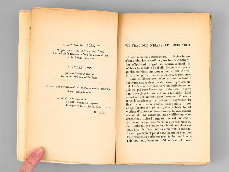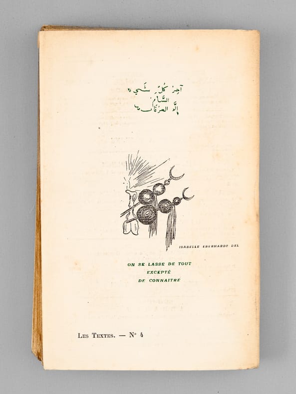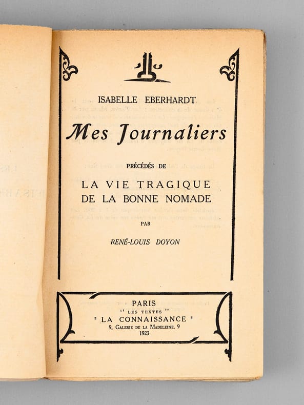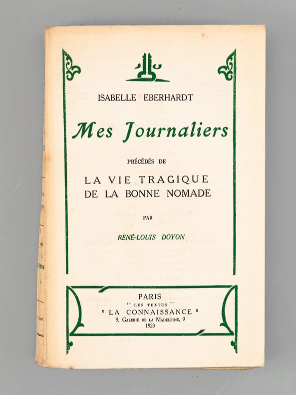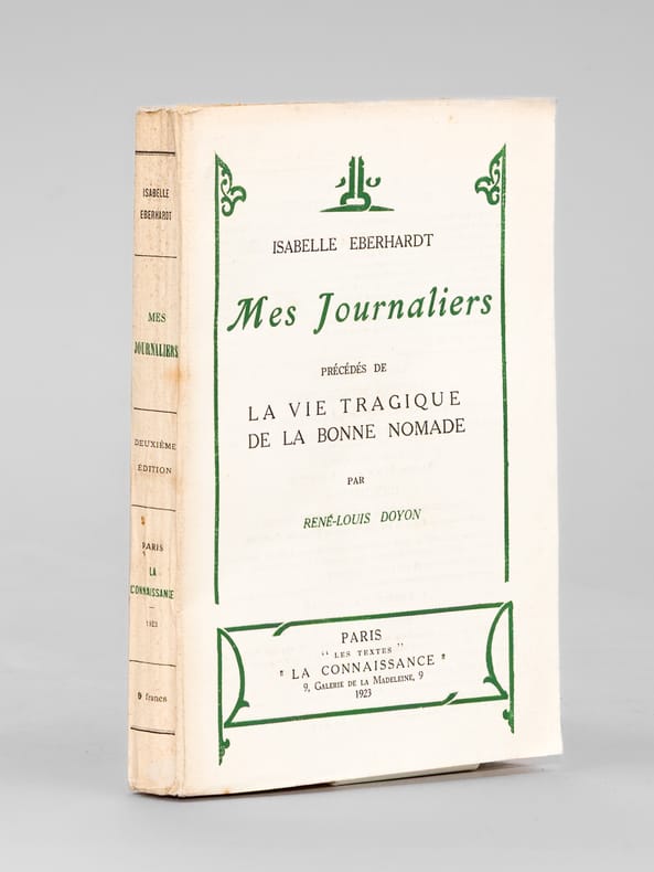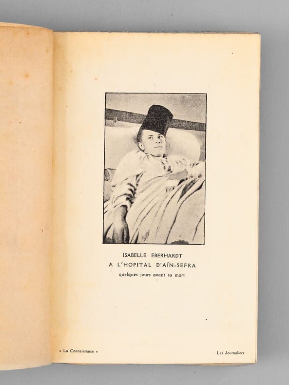 Exploratrice et journaliste, Isabelle Eberhardt (1877-1904) est suisse d'origine russe. Elevée dans le tolstoïsme et l'anarchisme, elle fréquente les milieux turcs et anarchistes de Genève. Elle se convertit à l'Islam quand sa mère part vivre à Bône en Algérie. Expulsée, elle épouse Slimane Ehnni, musulman de nationalité française, sous-officier de spahis, ce qui lui permet de revenir en Algérie. Elle séjourne souvent dans le sud algérien, et meurt le 21 octobre 1904, à Aïn Sefra dans la crue d'un oued. Bon état pour cet exemplaire sur papier vergé non justifié (mention de deuxième édition au dos, pas de mention d'édition en page de titre).