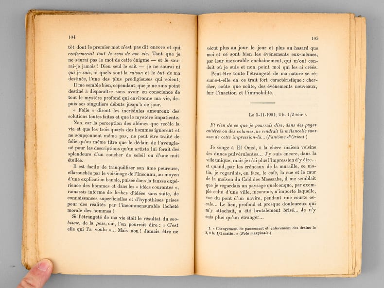 Paris, La Connaissance, 1923, in-12, LXXXIII-300 pp, Similicuir à gros grain rouille, dos à nerfs orné de fleurons noir et de filets dorés, couverture conservée, Édition originale de ces notes en forme de journal intime et de voyage qui le mena de Suisse au Sahara. Elles sont illustrées de petits croquis d'Eberhardt en noir dans le texte, de 2 fac-similés, et 2 reproductions photographiques en noir. Un des 234 exemplaires sur vergé pur fil, second et dernier grand papier. Bel exemplaire. Couverture rigide