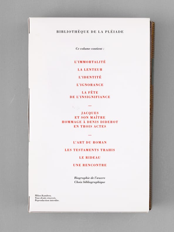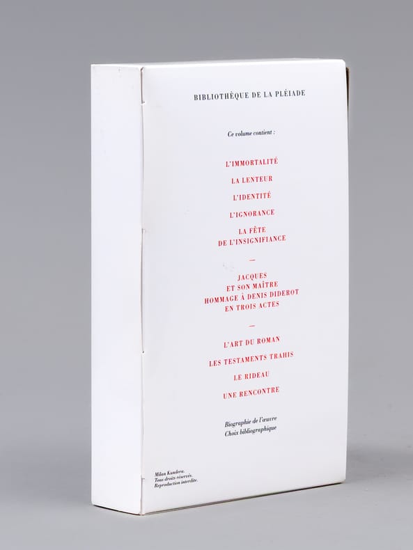Bon état (petits frott. à la jaquette, très bon état par ailleurs). Contient : L'Immortalité - La Lenteur - L'Identité - L'Ignorance - La Fête de l'insignifiance - Jacques et son maître - L'Art du roman - Les Testaments trahis - Le Rideau - Une rencontre.
