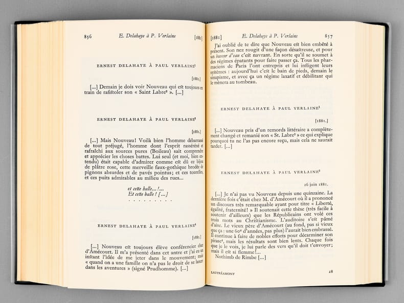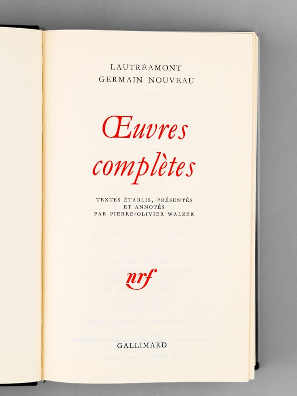 Très bon état. Contient, de Lautréamont : Les Chants de Maldoror - Poésies - Lettres ; et de Germain Nouveau : Premiers poèmes (1872-1879) - Dixains réalistes (1876) - La Doctrine de l'amour (1879-1881) - Sonnets du Liban (1884) - Valentines (1885-1887) - (Le Calepin du mendiant) - Le Maron travesti ou la quatrième églogue de Virgile mise en vers burlesques... - Ave Maris Stella - Placet rimé - Contribution à l'«Album Zutique» et à l'«Album Richepin» - La Petite baronne - La Sourieuse - Notes parisiennes - Le Manouvrier - Notes d'un réserviste - Petits tableaux parisiens - Correspondance (1866-1918).
