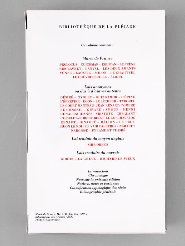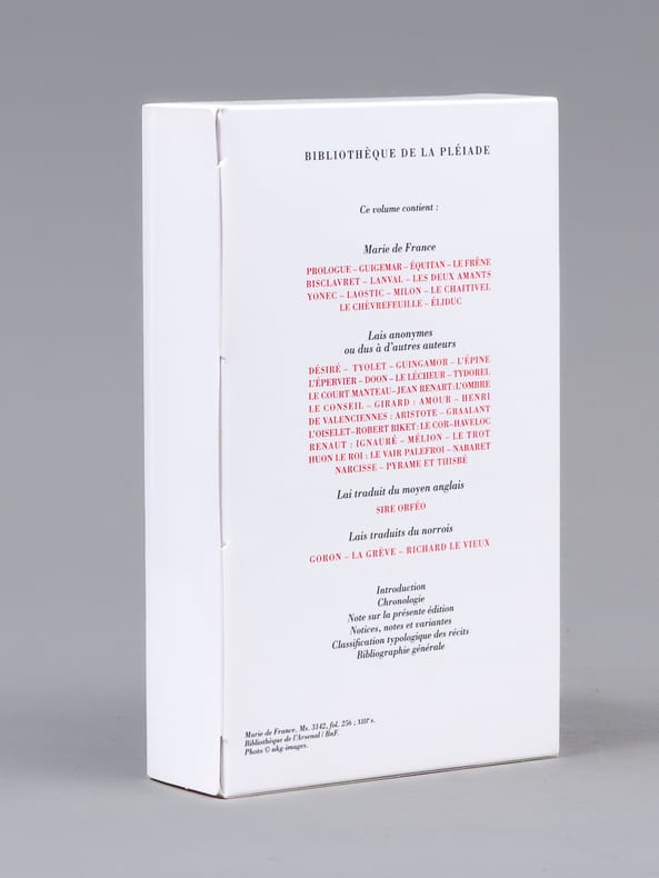 Très bon état. Contient : Lais traduits du norrois : Richard le Vieux - La Grève - Goron. Lai traduit du moyen anglais : Sire Orféo. Marie de France : Prologue - Guigemar - Équitan - Le Frêne - Bisclavret - Lanval - Les deux Amants - Yonec - Laostic - Milon - Le Chaitivel - Le Chèvrefeuille - Éliduc. Lais anonymes ou dus à d’autres auteurs : Désiré - Tyolet - Guingamor - L'Épine - L'Épervier - Doon - Le Lécheur - Tydorel - Le Court Manteau - L'Ombre (de Jean Renart) - Le Conseil - Amour (de Girard) - Aristote (d'Henri de Valenciennes) - Graalant - L'Oiselet - Le Cor (de Robert Biket) - Haveloc - Ignauré (de Renaut) - Mélion - Le Trot - Le Vair Palefroi (de Huon Le Roi) - Nabaret - Narcisse - Pyrame et Thisbé.