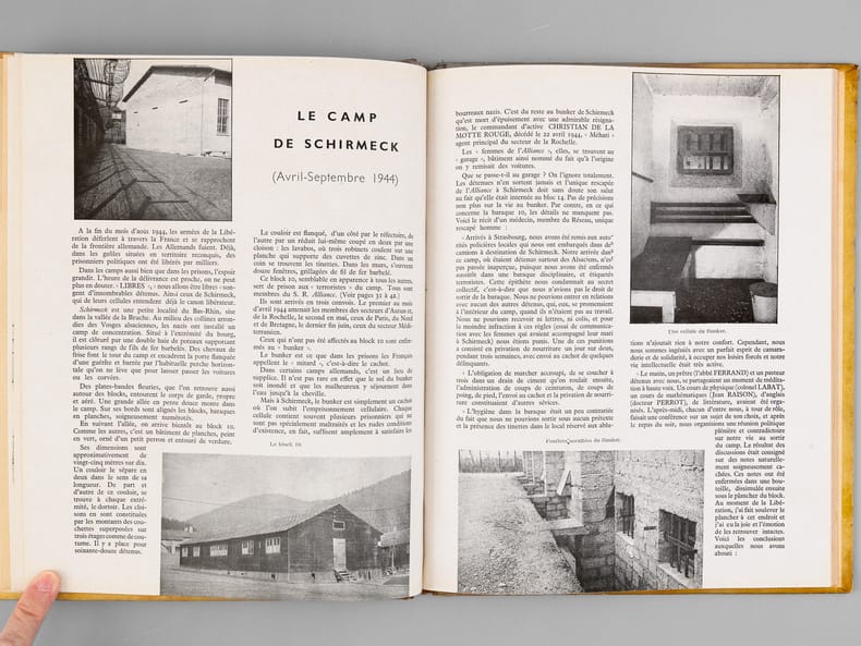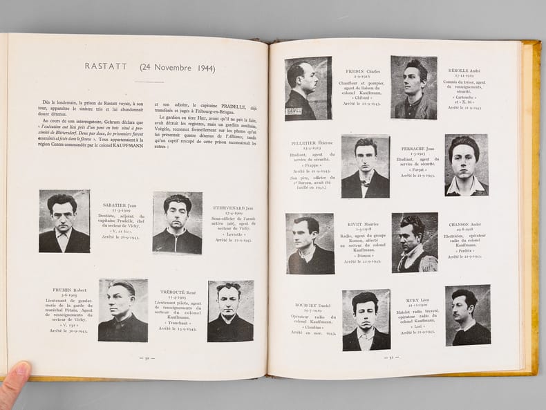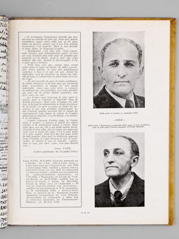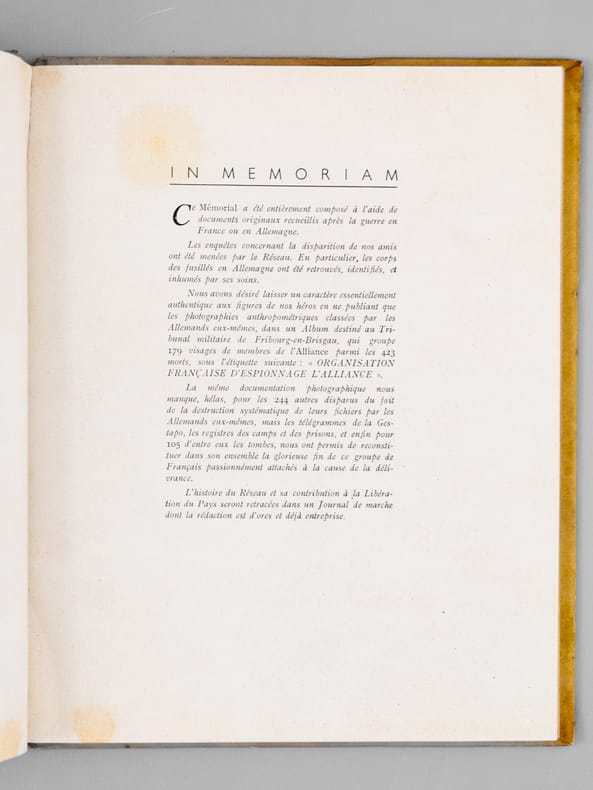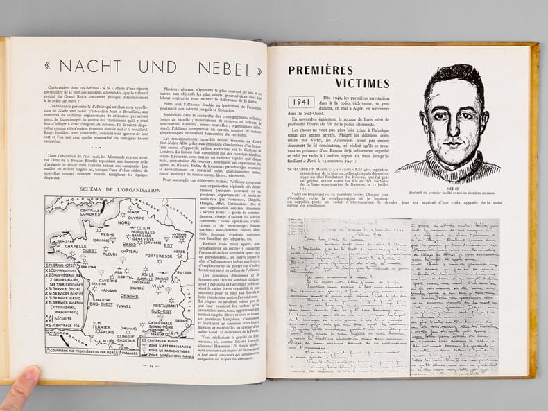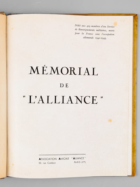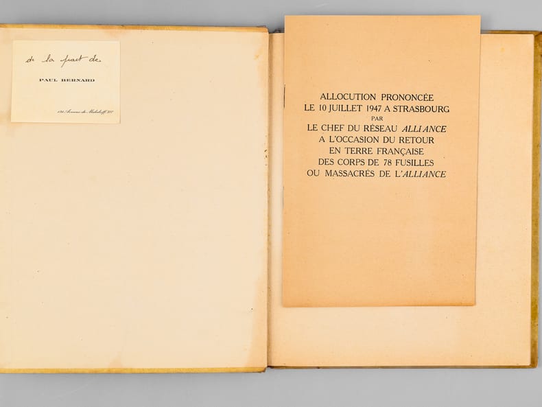 Avec carte de visite jointe "de la part de Paul Bernard". Rare exemplaire de cet impressionnant et émouvant mémorial du réseau de résistance "Alliance", dirigé après l'arrestation de Georges Loustaunau-Lacau par Marie-Madeleine Fourcade, et surnommé "Arche de Noé" par les allemands en raison des pseudonymes d’animaux donnés à ses membres. On y joint le tout aussi rare discours du 10 juillet 1947. Bon état (petit accroc en mors).