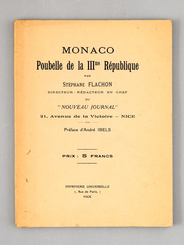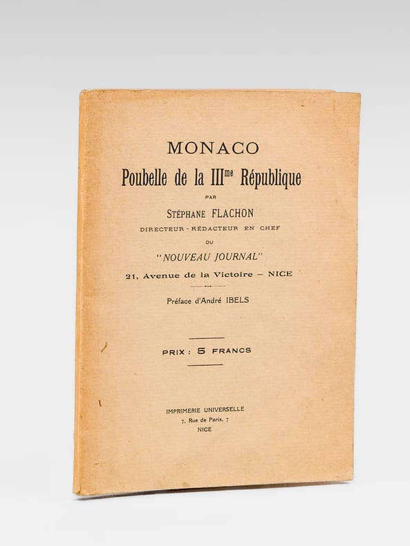 Par Stéphane Flachon, Directeur-Rédacteur en chef du "Nouveau Journal" 21 Avenue de la Victoire, Nice, Préface d'André Ibels, 1 vol. in-12 br., Imprimerie Universelle, Nice, s.d. [ circa 1924 ], 107 pp.