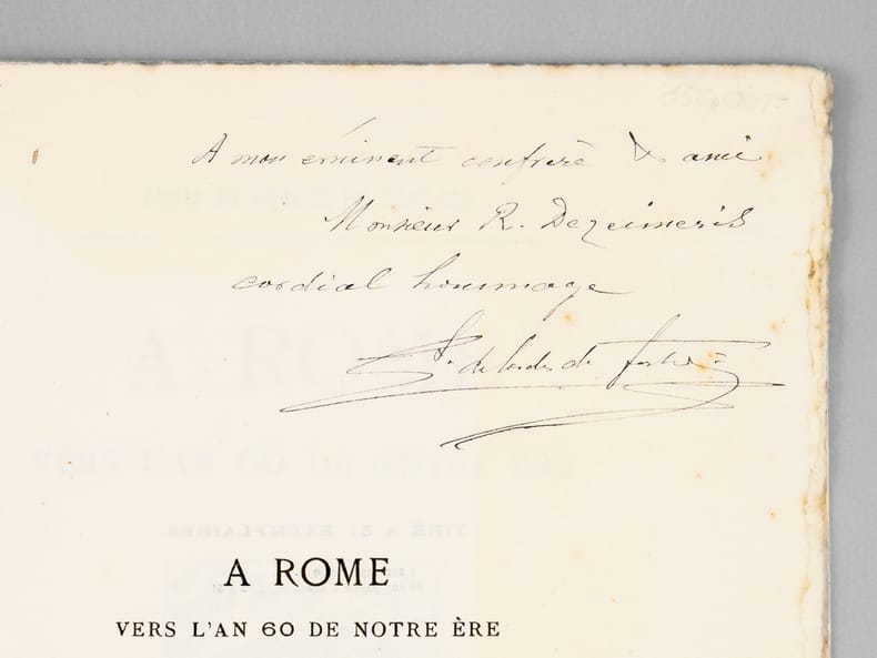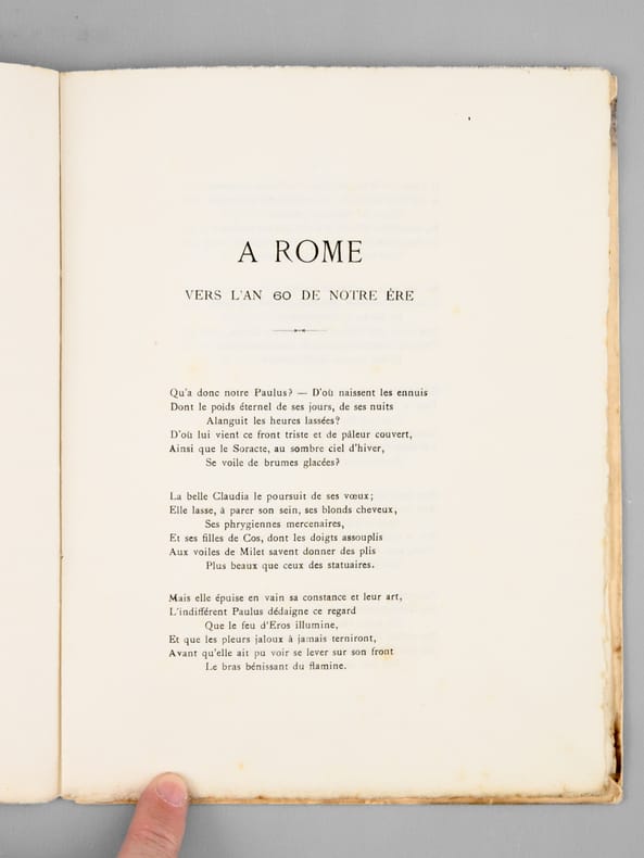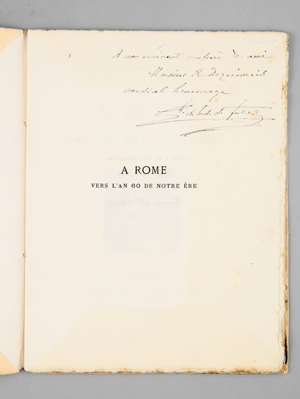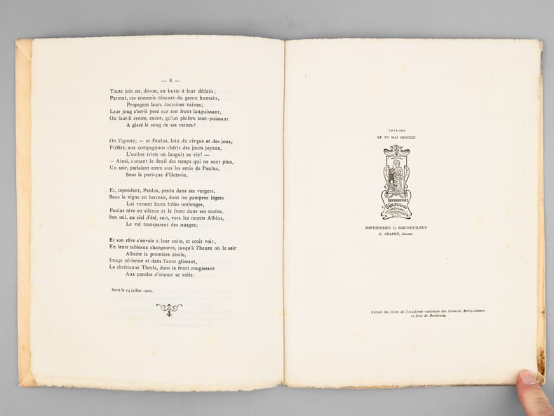 L'exemplaire est dédicacé par le grand bibliophile bordelais Louis de Bordes de Fortages "à mon éminent confrère & ami Monsieur R. Dezeimeris, cordial hommage". Reinhold Dezeimeris (1835-1913) fut avec plusieurs bibliophiles dont Gustave Brunet et Jules Delpit le fondateur de la "Société des Bibliophiles de Guyenne". Charmant poème à la manière antique, évoquant l'amour de Paulus pour la chrétienne Thécla. Etat très satisfaisant (couv. lég. frottée).