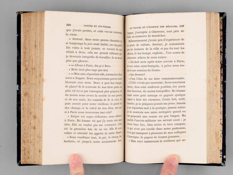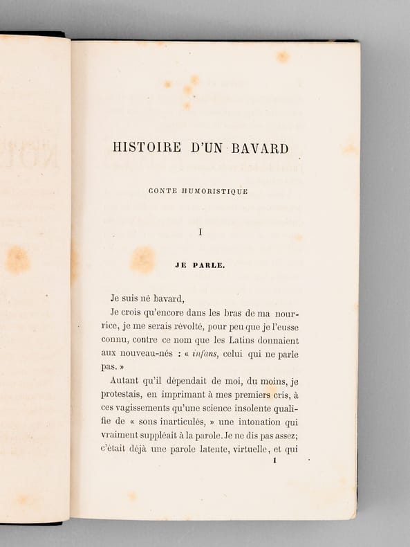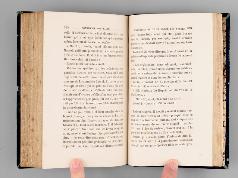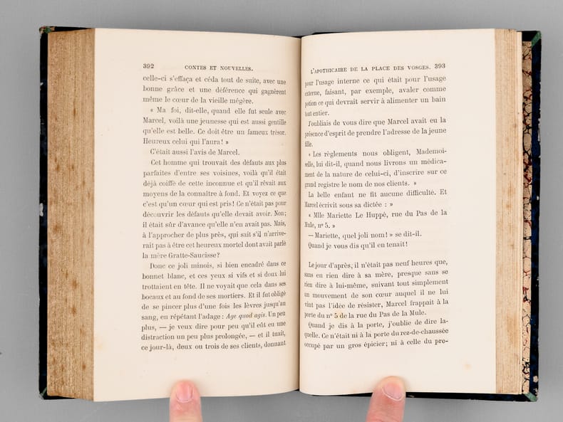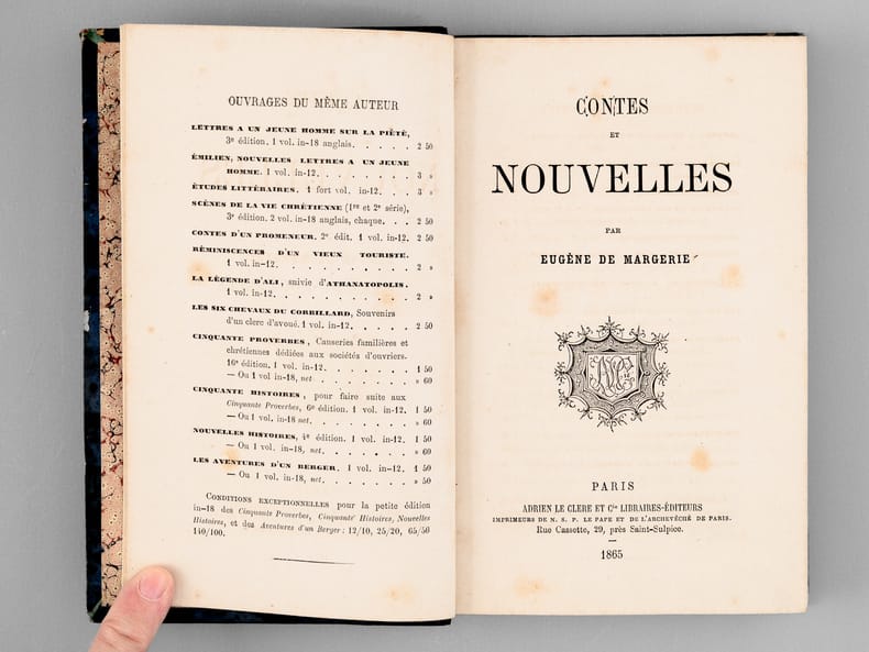 Rare exemplaire de ce curieux recueil de nouvelles, qui semble avoir été tiré en petit nombre. Etat très satisfaisant (coiffes frottées, coupes lég. frottée, ex-libris en garde).