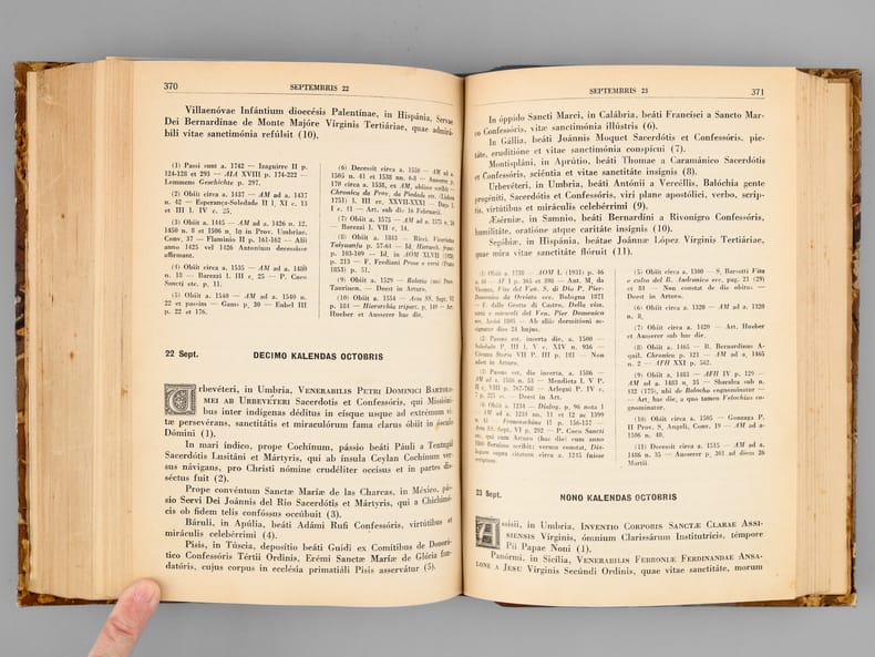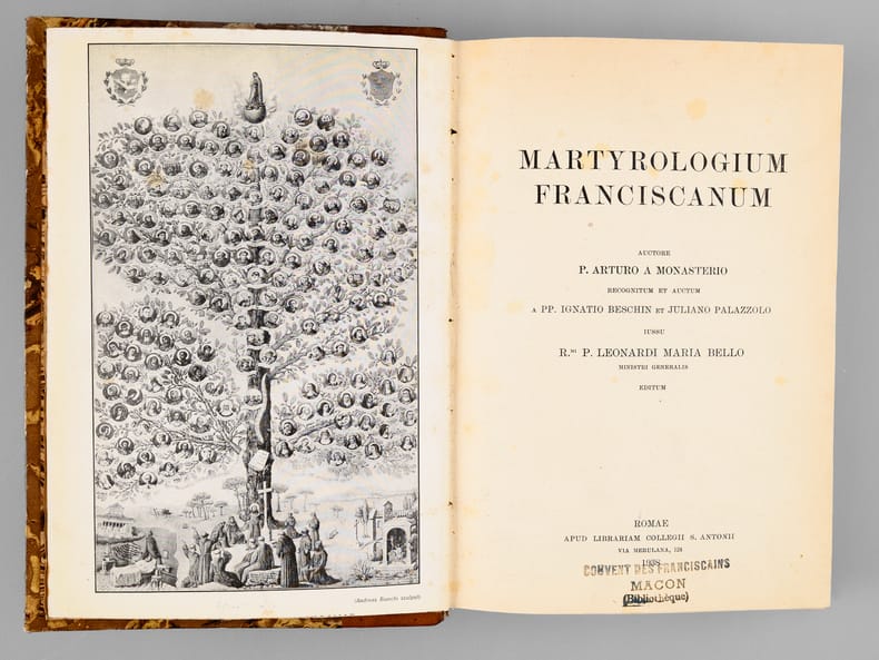 Etat très satisfaisant (dos un peu frotté, rares annotations, ancien cachet du couvent des franciscains de Mâcon) pour cet exemplaire du martyrologe franciscain, bien relié.