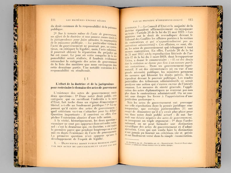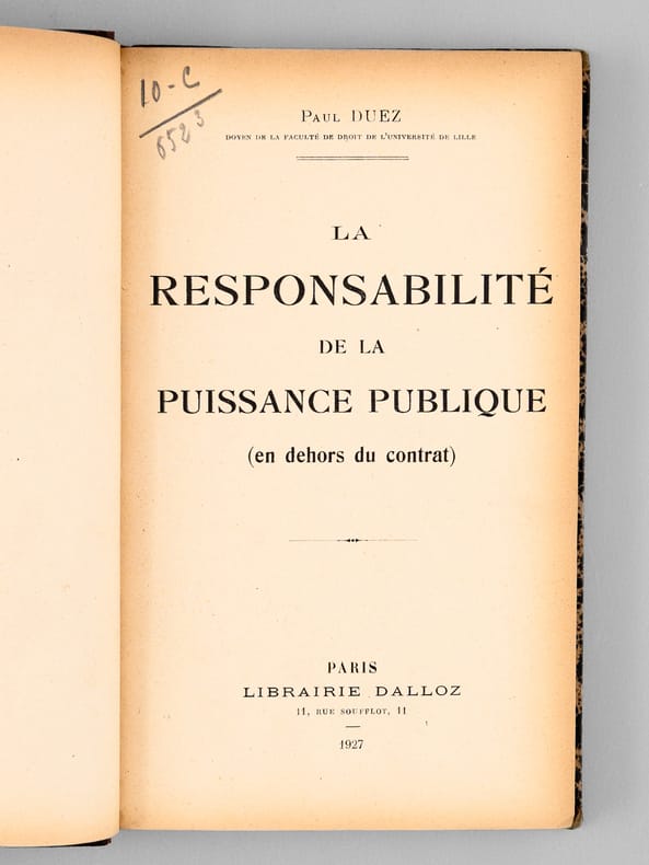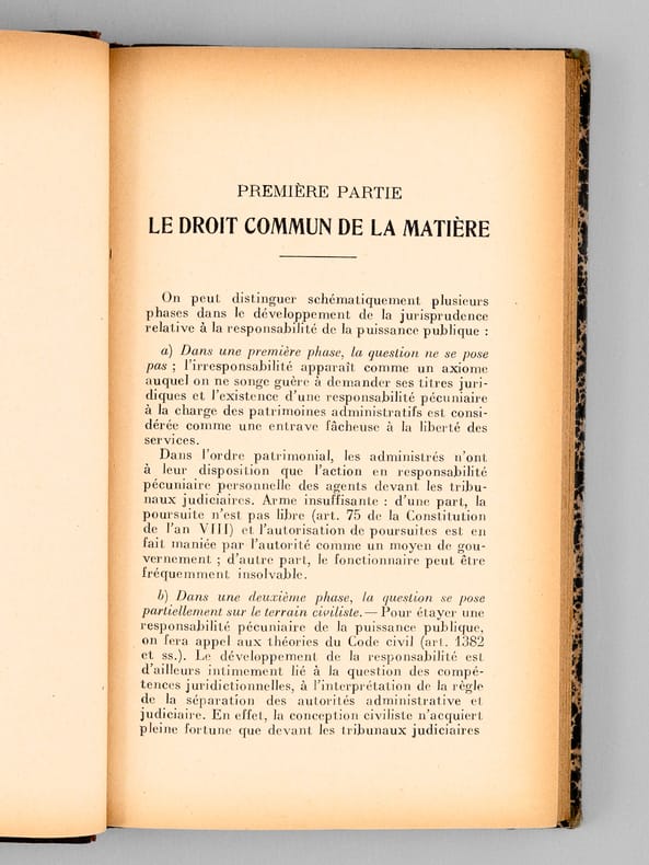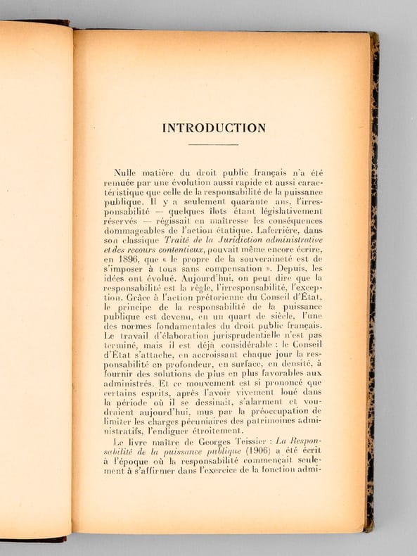 Ainsi que l'écrit l'auteur, "nulle matière du droit public français n'a été remuée par une évolution aussi rapide et aussi caractéristique que celle de la responsabilité de la puissance publique. Il y a seulement quarante ans, l'irresponsabilité [... ] régissait en maîtresse". Etat très satisfaisant (dos un peu frotté, bon état par ailleurs)