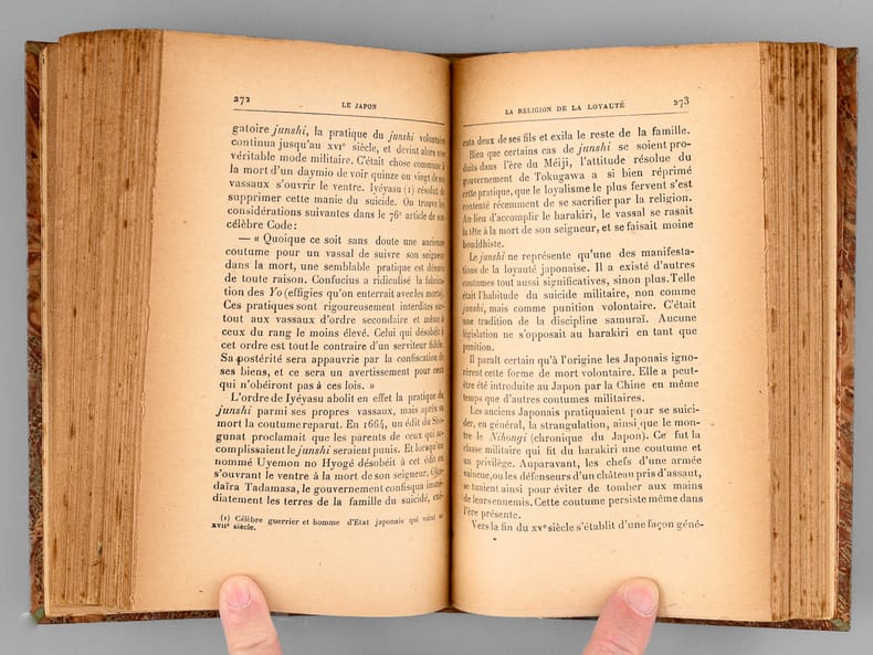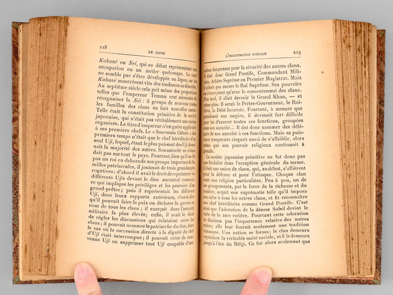 Croquis, cartes et tableaux in-texte. Bien complet des 3 cartes couleurs dépliantes en fin de volume. "Au mois d'août 1884, le gouvernement japonais, qui s'occupait déjà de réorganiser son armée à l'européenne, demanda à la France quelques officiers instructeurs. Le lieutenant de Villaret fut désigné pour faire partie de la mission militaire. Parti comme lieutenant, il fut nommé capitaine le 30 décembre 1884 et, le 28 décembre 1886, il recevait du gouvernement japonais la décoration de l'Ordre du Soleil levant. Pendant les trois ans qu'il vécut au Japon, il chercha à en savoir plus sur ce pays, son âme et son passé. Aussi il tenta, à la suite de voyages assez nombreux et méthodiques, une description de l'empire du Soleil levant. Dans un volume très documenté, il indique la physionomie générale de cet Etat, l'histoire du développement de la nation, en ajoutant quelques indications succinctes sur la religion, la langue, les mœurs, l'organisation politiques, l'armée." [wiki]. Edition originale.