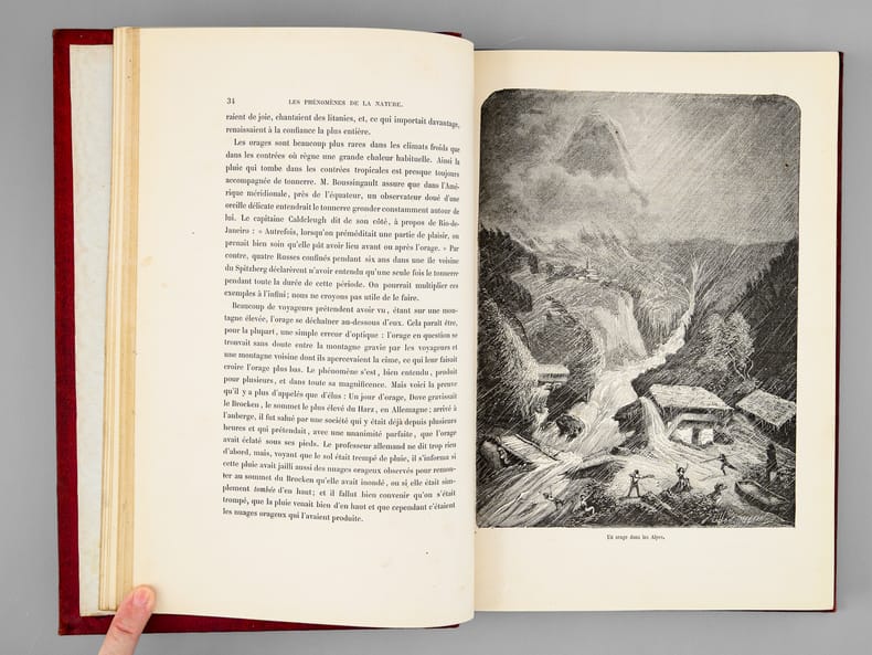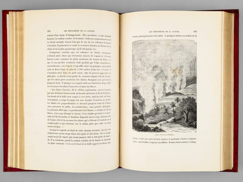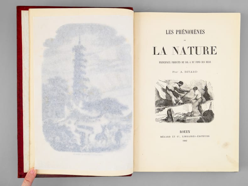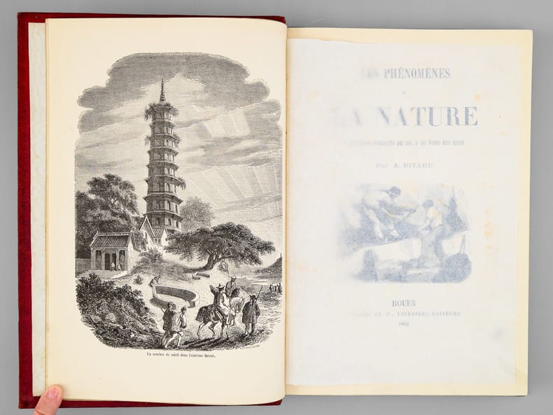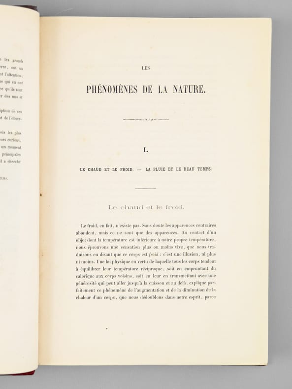 Très intéressant ouvrage de vulgarisation, évoquant notamment les phénomènes lumineux naturels (mirages, arc-en-ciel, halos, aurores polaires...), l'océan et ses phénomènes (marées, mascaret, proroca, raz de marée, maëlstrom, Charybde et Scylla, naufrageurs...), les mers glaciales, les montagnes et les glaciers (dont les moraines et les glaciers disparus), les cataractes et geysers (ont chutes Victoria, Niagara, cascades de l'Oued-el-Roumel, cataractes de la Yellowstone, les geysers de boue...), les volcans et tremblements de terre, les produits du sol (ivoire, corail, tourbe, olives, gutta-percha, résine, truffe, bombonaxa ou paille à chapeau de Panama, etc...). Etat très satisfaisant (dos un peu frotté, belle fraîcheur intérieure)