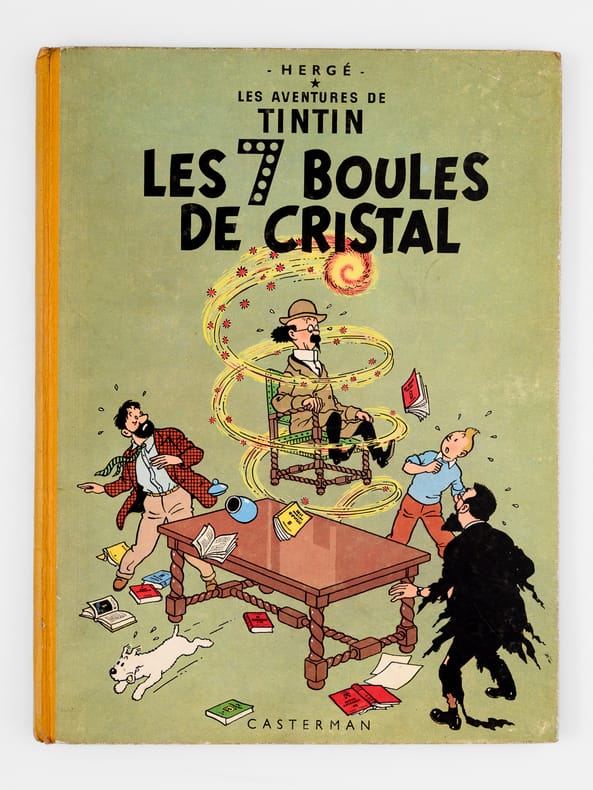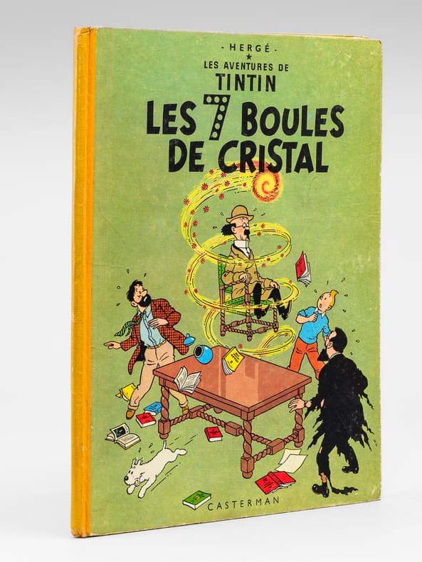 Paris, Editions Casterman, 1958, 1 vol., 62 p. (30,5 x 23,2 cm), cartonnage d'éditeur illustré, dos toilé jaune, 4ème plat B24. Hergé (1907-1983) : dessinateur et scénariste de bandes dessinées. Les 7 boules de cristal est son 13ème album consacré au célèbre petit reporter Tintin.