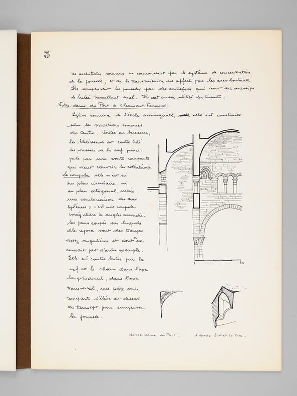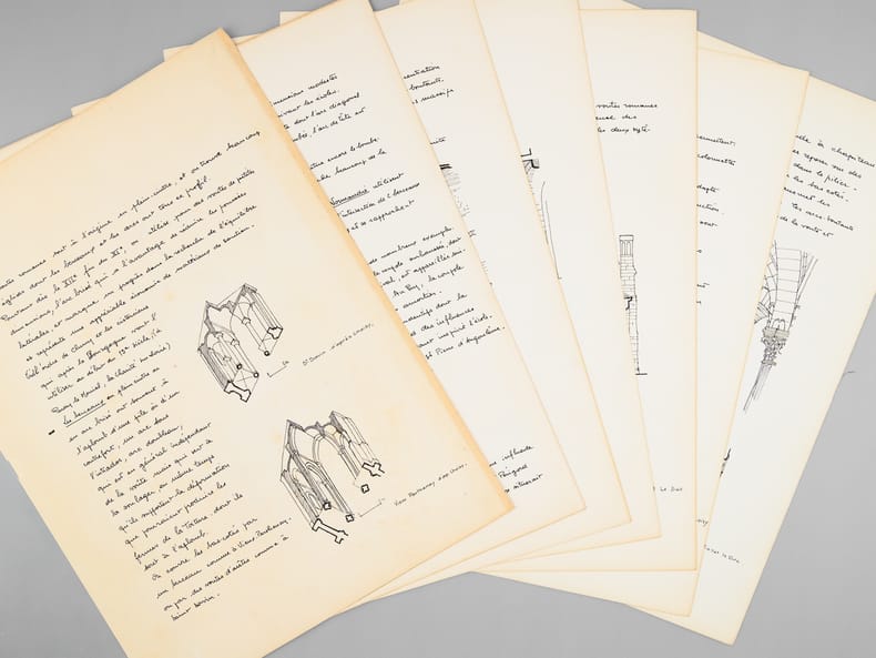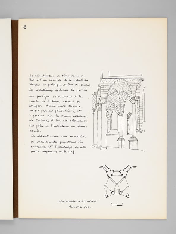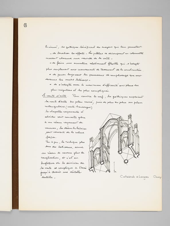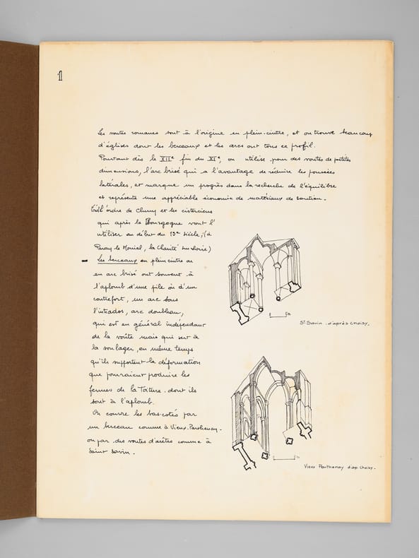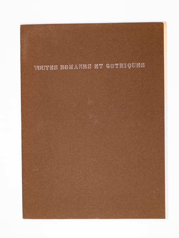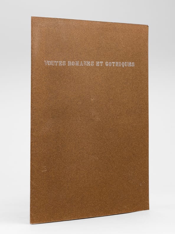 Beau dossier manuscrit dessiné par un élève architecte de 2e classe de l'ERAB (Ecole Régionale d'Architecture de Bordeaux) dans le cadre du cours d'histoire de l'Architecture, dirigée par Claude Ferret de l'Atelier Ferret, en 1962. Dans ce dossier, on trouvera des dessins de voûtes de St Savin, du Vieux Parthenay, de la cathédrale de Langres, etc... d'après Choisy ou Viollet-le-Duc. Bon état (deux piqûres de punaisage au centre).