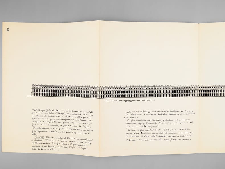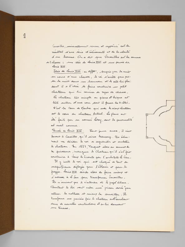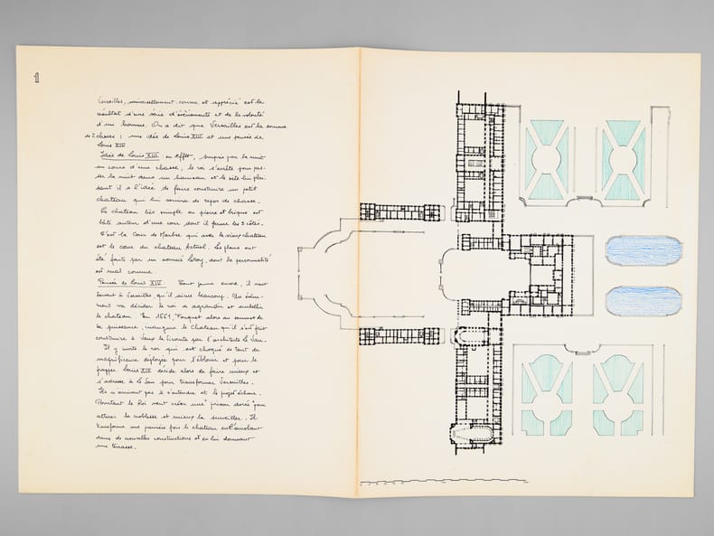Beau dossier manuscrit dessiné par un élève architecte de 2e classe de l'ERAB (Ecole Régionale d'Architecture de Bordeaux) dans le cadre du cours d'histoire de l'Architecture, dirigée par Claude Ferret de l'Atelier Ferret, en 1962. Dans ce dossier, on trouvera une coupe horizontale et la grande façade du château de Versailles. Bon état (piqûres de punaisage au centre des feuillets) pour ce joli travail.