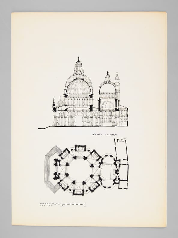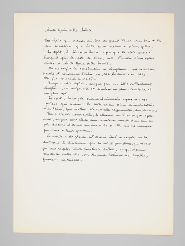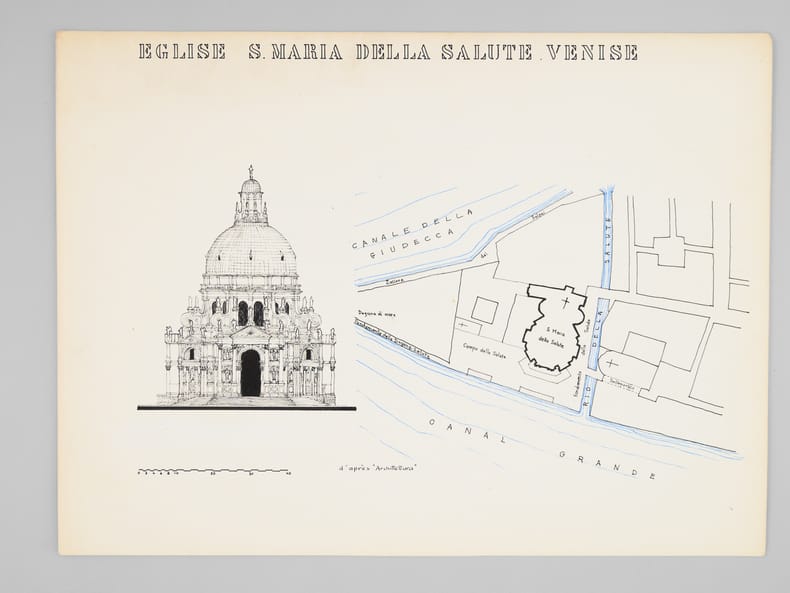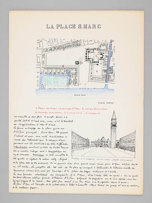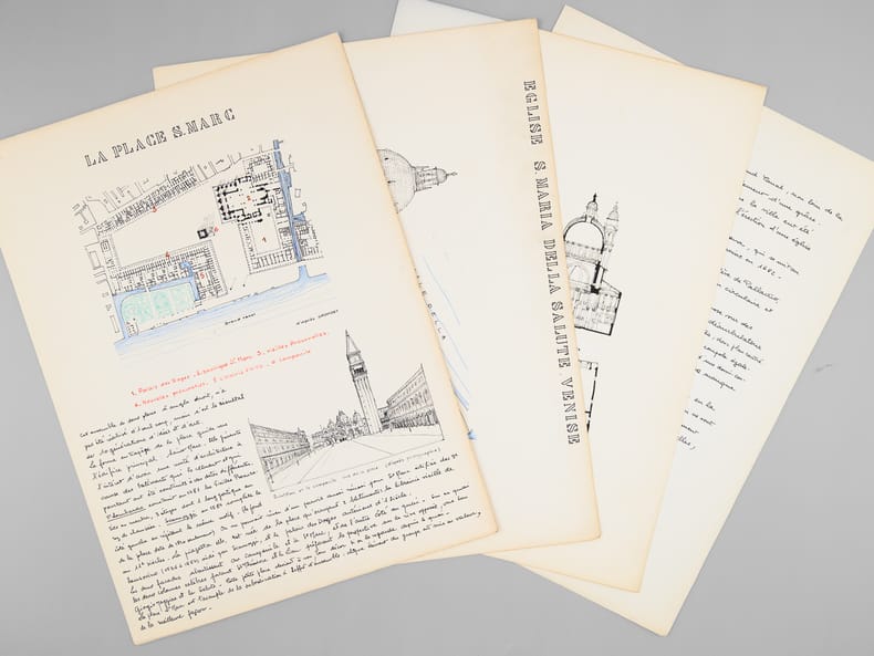 Beau dossier manuscrit dessiné par un élève architecte de 2e classe de l'ERAB (Ecole Régionale d'Architecture de Bordeaux) dans le cadre du cours d'histoire de l'Architecture, dirigée par Claude Ferret de l'Atelier Ferret, en 1962. Bon état (piqûres de punaisage au centre).