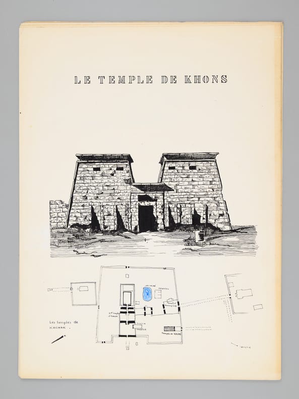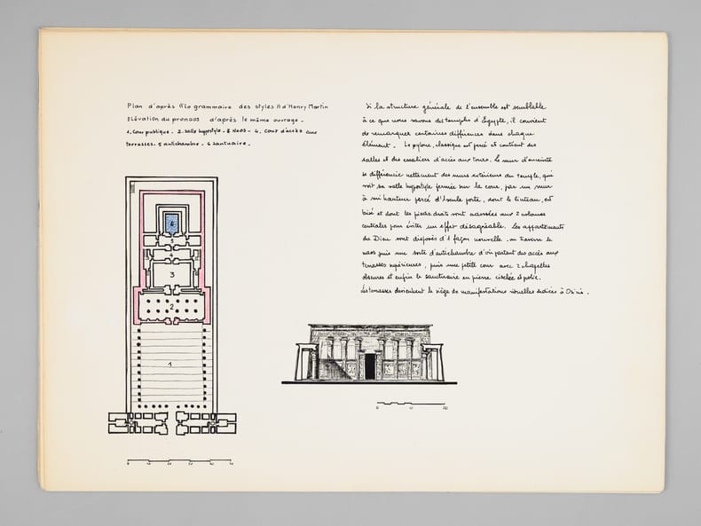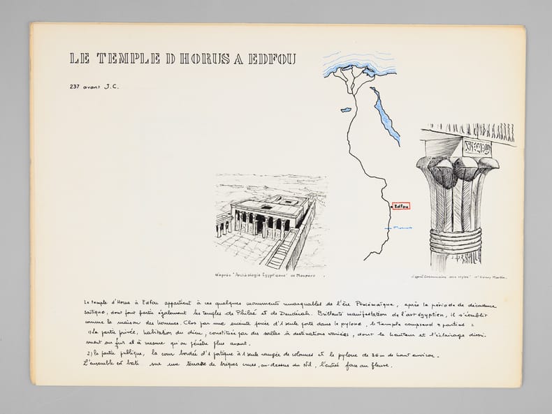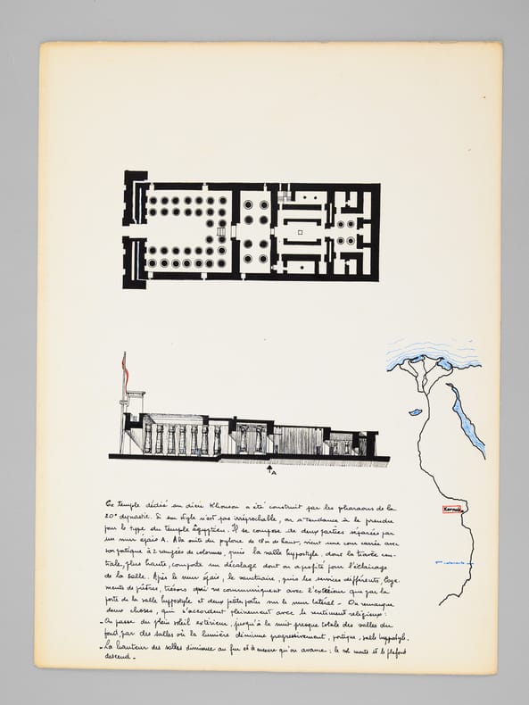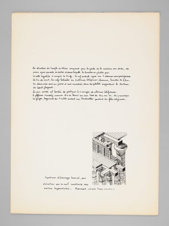 Beau dossier manuscrit dessiné par un élève architecte de 2e classe de l'ERAB (Ecole Régionale d'Architecture de Bordeaux) dans le cadre du cours d'histoire de l'Architecture, dirigée par Claude Ferret de l'Atelier Ferret, en 1962. Bon état (piqûres de punaisage au centre).