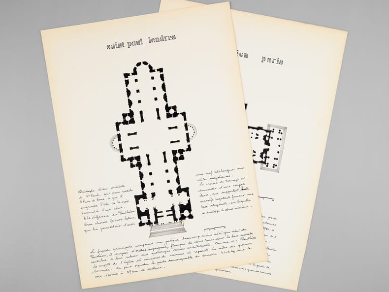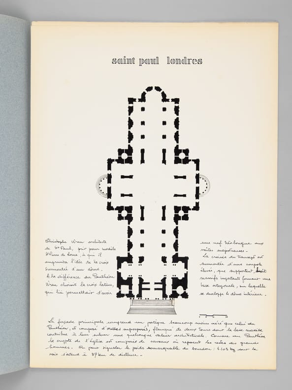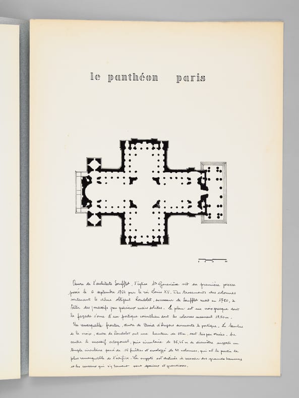Beau dossier manuscrit dessiné par un élève architecte de 1ère classe de l'ERAB (Ecole Régionale d'Architecture de Bordeaux) dans le cadre du cours d'histoire de l'Architecture, dirigée par Claude Ferret de l'Atelier Ferret, en 1961. Bon état (piqûres de punaisage au centre).