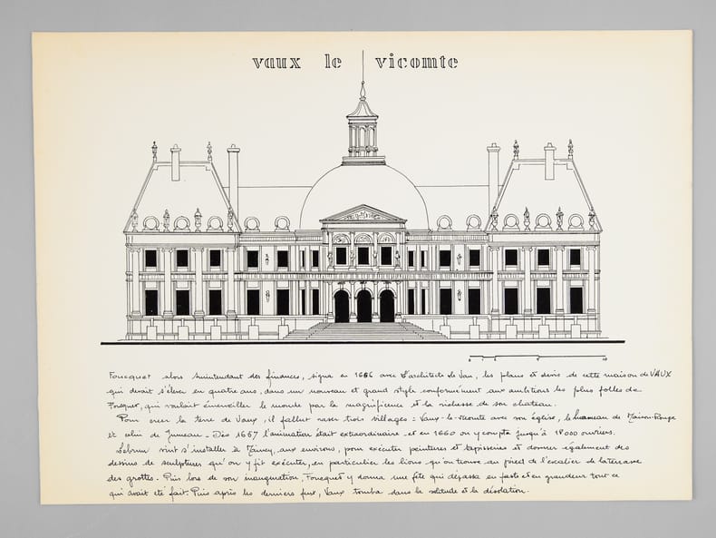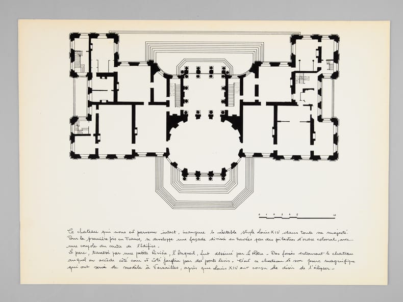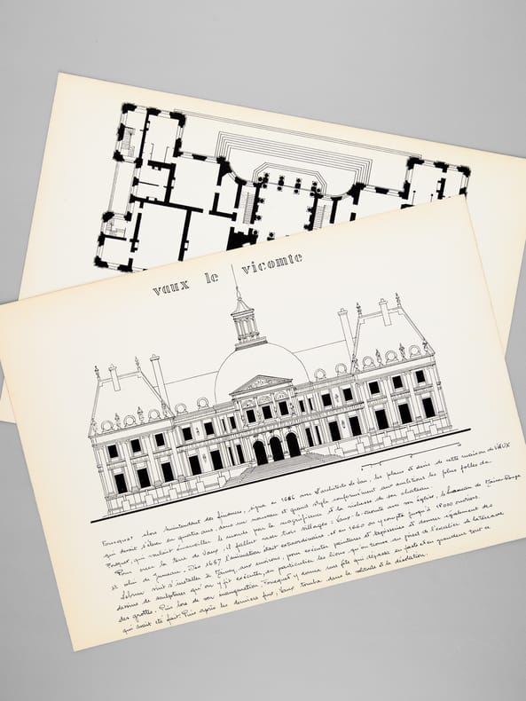 Beau dossier manuscrit dessiné par un élève architecte de 1ère classe de l'ERAB (Ecole Régionale d'Architecture de Bordeaux) dans le cadre du cours d'histoire de l'Architecture, dirigée par Claude Ferret de l'Atelier Ferret, en 1961. Bon état (piqûres de punaisage au centre).
