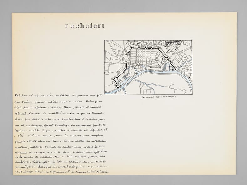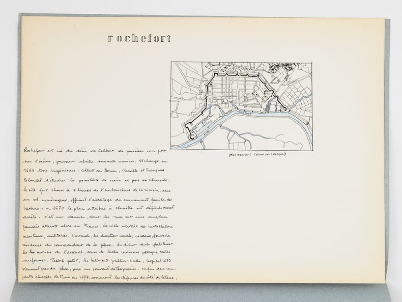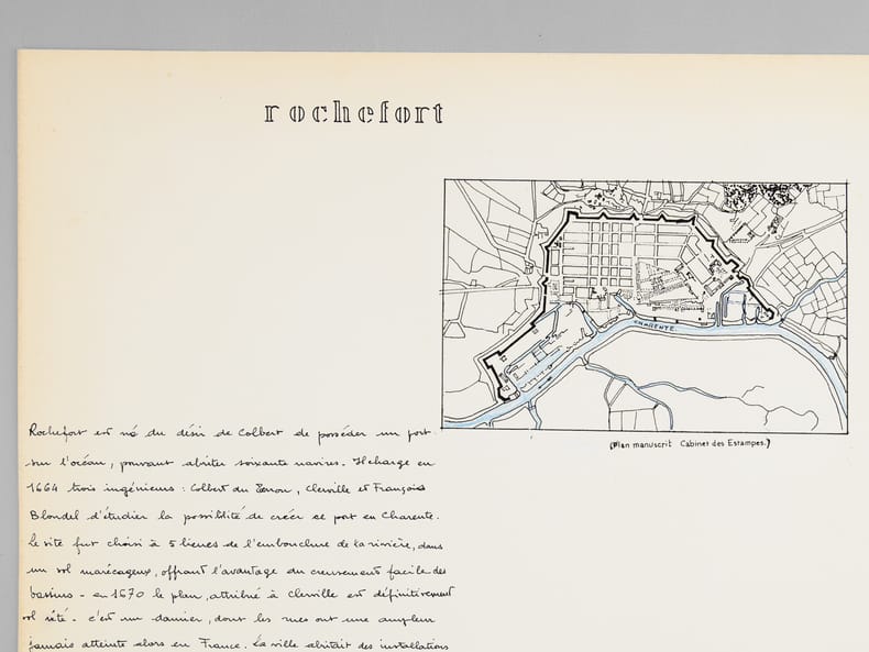 Beau dossier manuscrit dessiné par un élève architecte de 1ère classe de l'ERAB (Ecole Régionale d'Architecture de Bordeaux) dans le cadre du cours d'histoire de l'Architecture, dirigée par Claude Ferret de l'Atelier Ferret, en 1961. Bon état (piqûres de punaisage au centre).