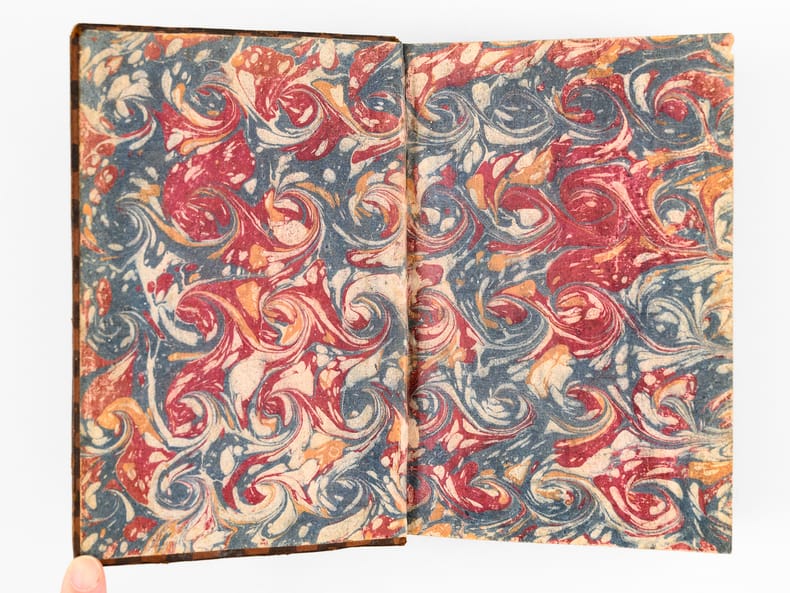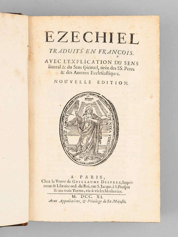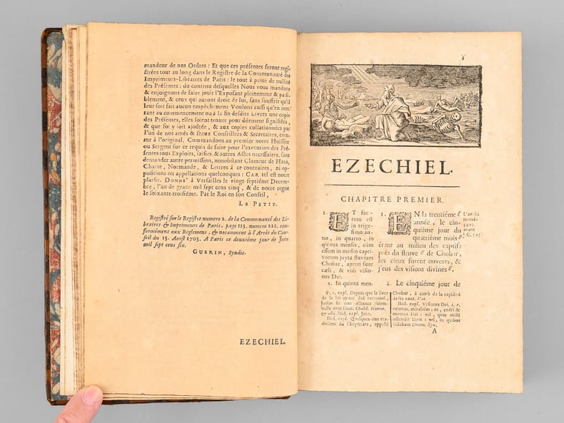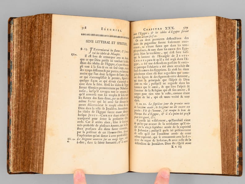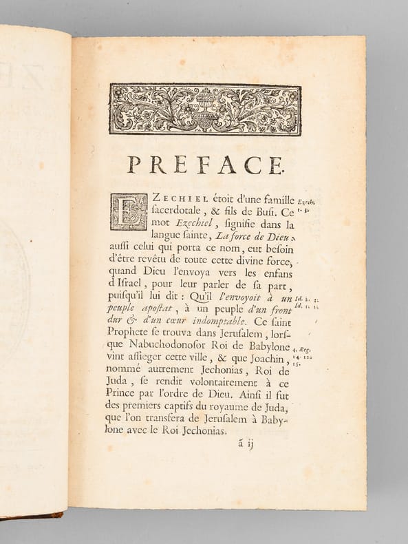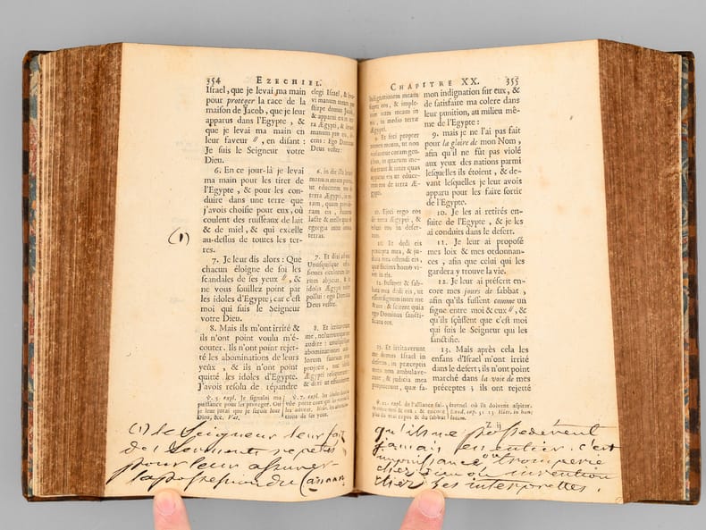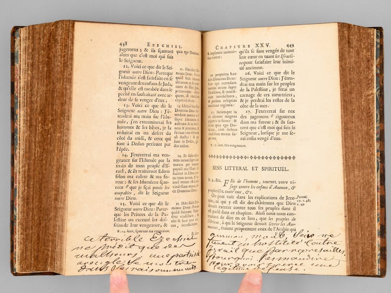 Curieux exemplaire annoté à la plume, probablement dans la seconde partie du XVIIIe siècle ou sous le Consulat ou l'Empire, par un théiste prônant le libre-examen. Etat très satisfaisant (petits mq. en coiffe, gommette de papier au dos en queue, bon état par ailleurs) pour ce curieux exemplaire enrichi de quelques annotations. Voir également dans notre catalogue d'autres volumes de cette Bible de Sacy en 32 volumes, enrichis des notes manuscrites du même annotateur, qui semble fort intéressé par les civilisations de l'Asie.
