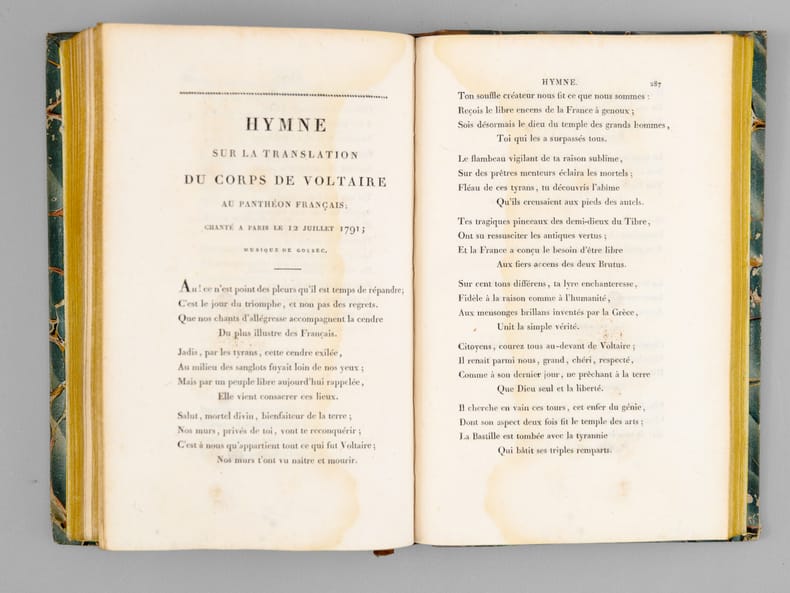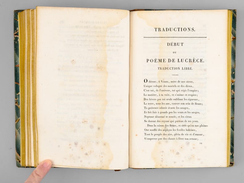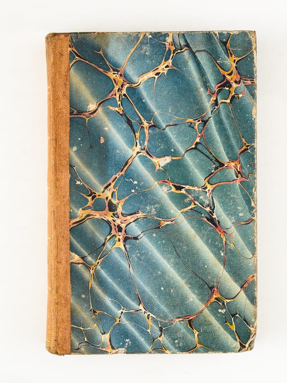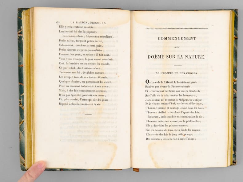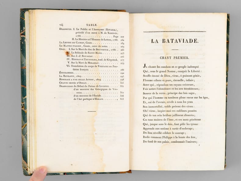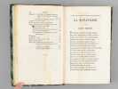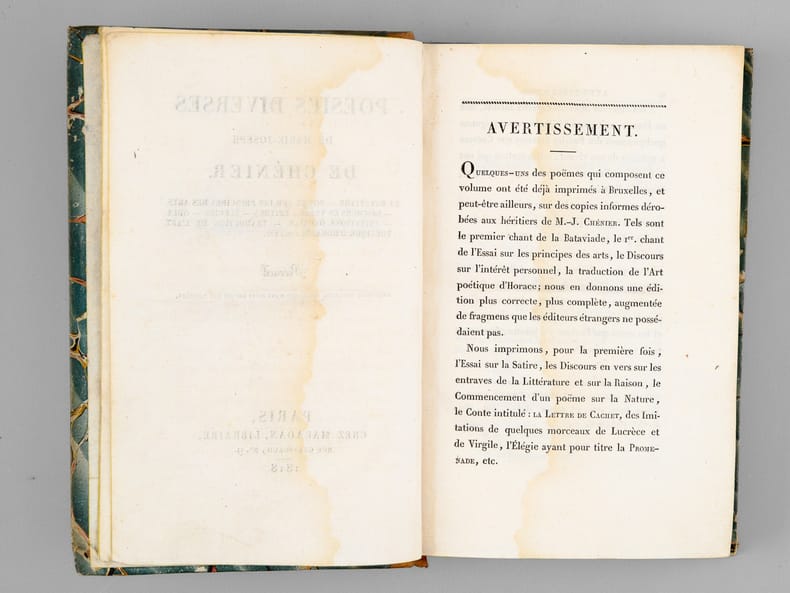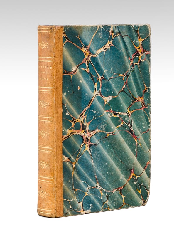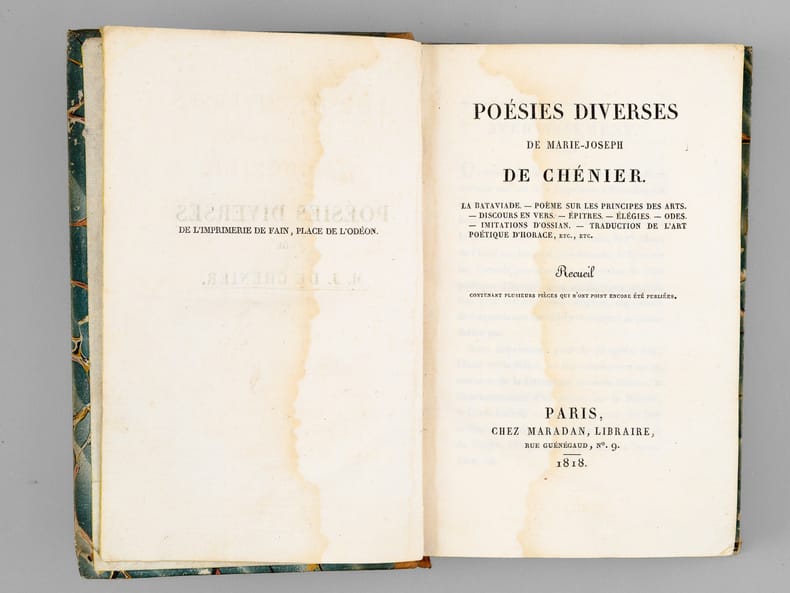 1 vol. in-12 rel. d'époque demi-basane tabac, dos lisse, chez Maradan Libraire, Paris, 1818, VVVII-408 pp.+ 14 pp. de catalogue. Titre complet : Poésies diverses de Marie-Joseph Chénier - La Bataviade , Pème sur les principes des arts , Discours en vers , Epitres , Elégies , Odes , Imitations d'Ossian , Traduction de l'Art Poétique d'Horace, etc etc - Recueil contenant plusieurs pièces qui n'ont point encore été publiées.