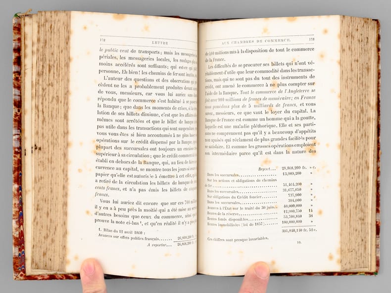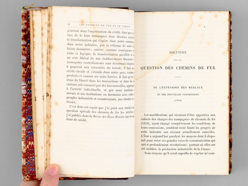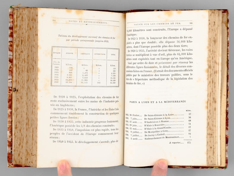 Etat satisfaisant (des rouss., trace d'anciennes mouill. sur premières pages, état très satisfaisant par ailleurs). Un ouvrage très intéressant pour étudier les coûts et le financement des chemins de fer au XIXe siècle. Peu courant.