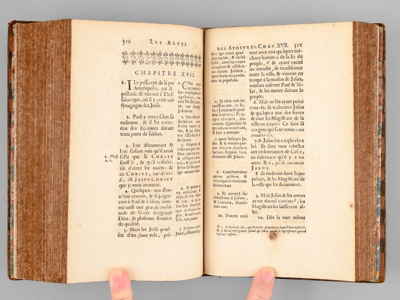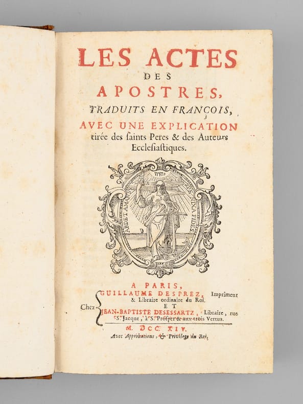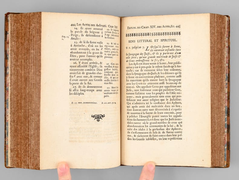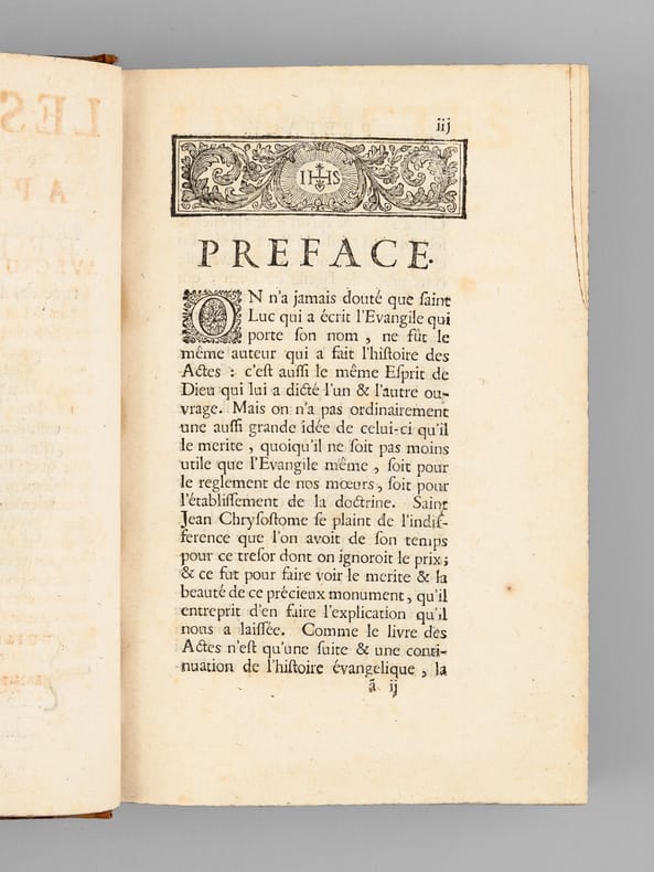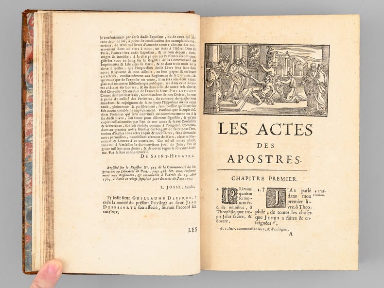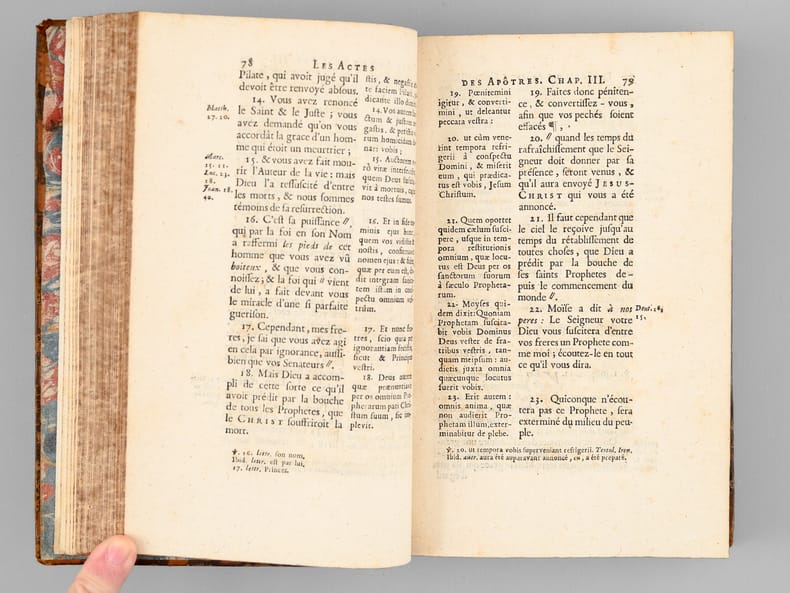Tome Premier seul (jusqu'au chapitre XX de l'Evangile selon Saint Matthieu). Etat très satisfaisant (petits mq. en coiffe, gommette de papier au dos en queue, coins un peu frottés, qq. mouill. anciennes, bon état par ailleurs) pour ce curieux exemplaire. Voir également dans notre catalogue d'autres volumes de cette Bible de Sacy en 32 volumes, souvent enrichis des notes manuscrites d'un annotateur, qui semble fort intéressé par les civilisations de l'Asie (cet exemplaire n'est pas annoté).