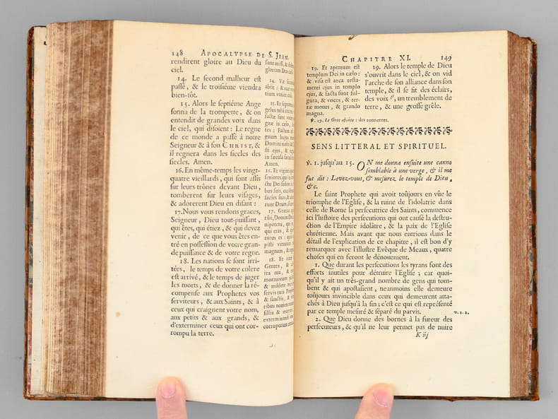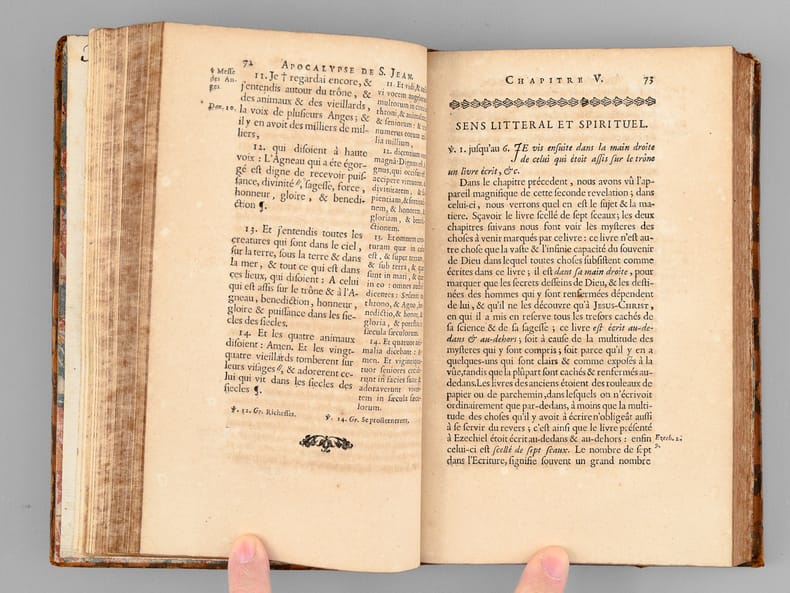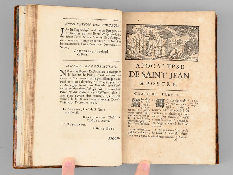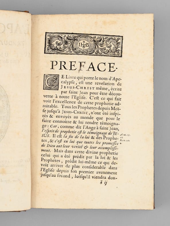 Bon état (très petit mq. en coiffe, gommette de papier au dos en queue, bon état par ailleurs). Voir également dans notre catalogue d'autres volumes de cette Bible de Sacy en 32 volumes, souvent enrichis des notes manuscrites d'un annotateur, qui semble fort intéressé par les civilisations de l'Asie (cet exemplaire n'est pas annoté).