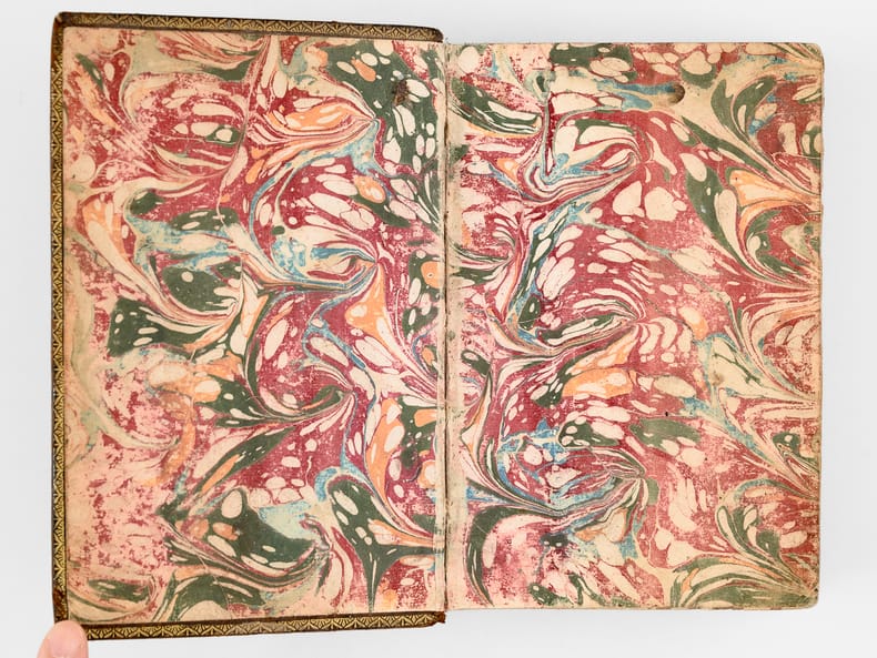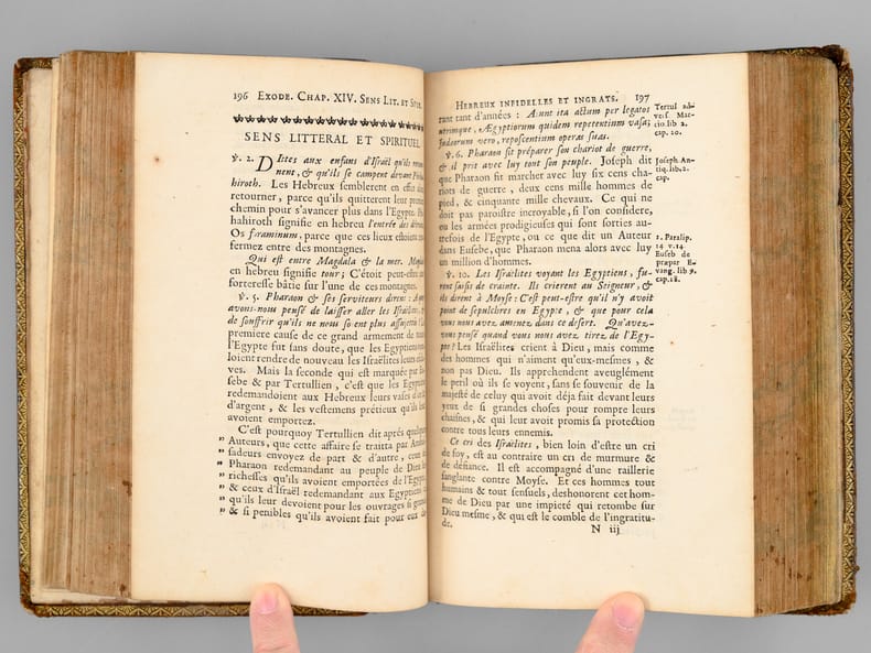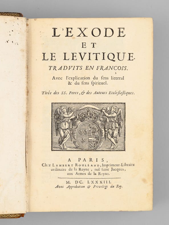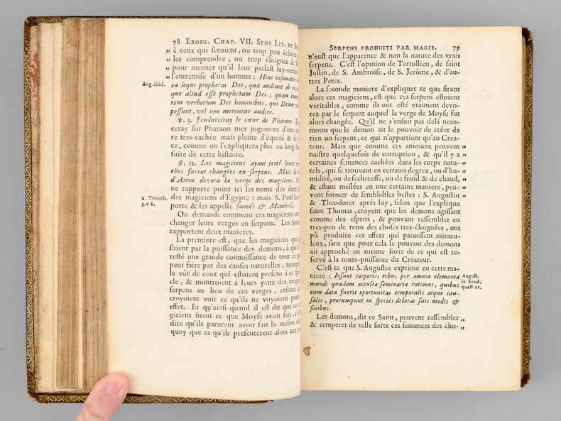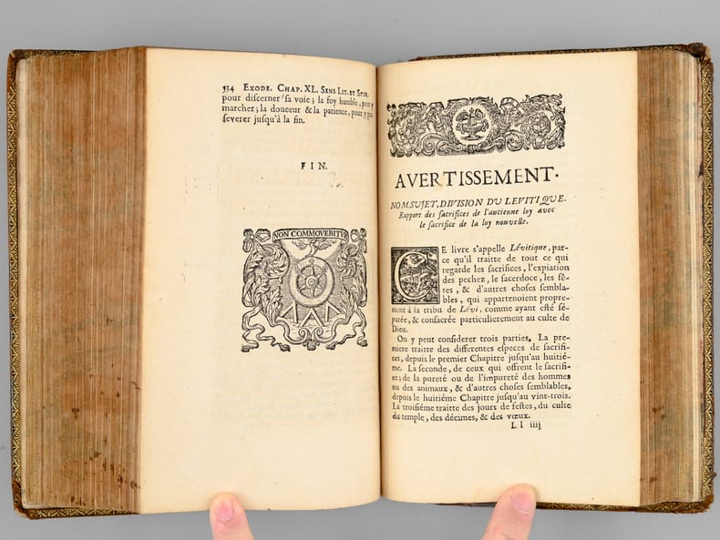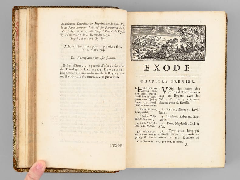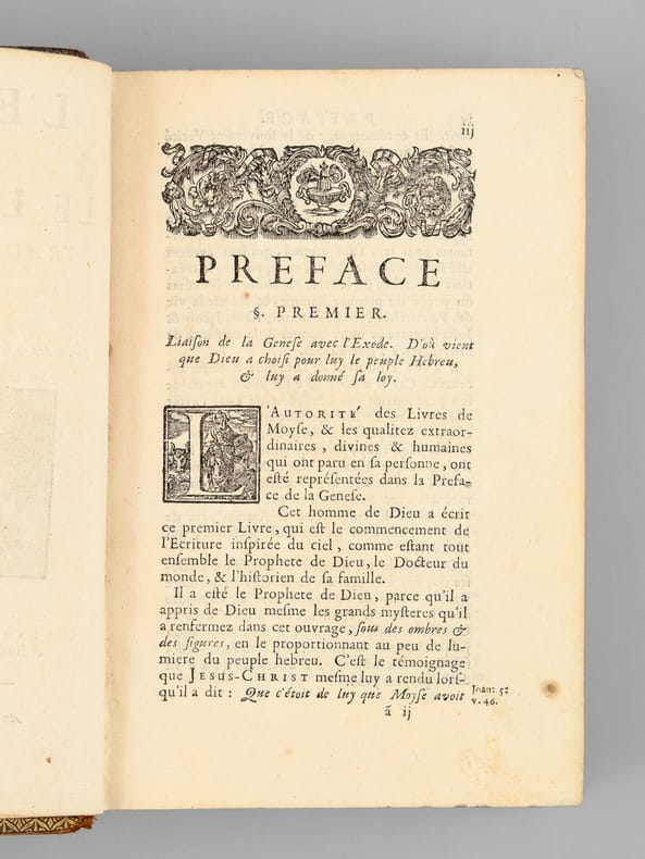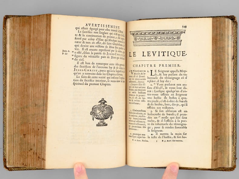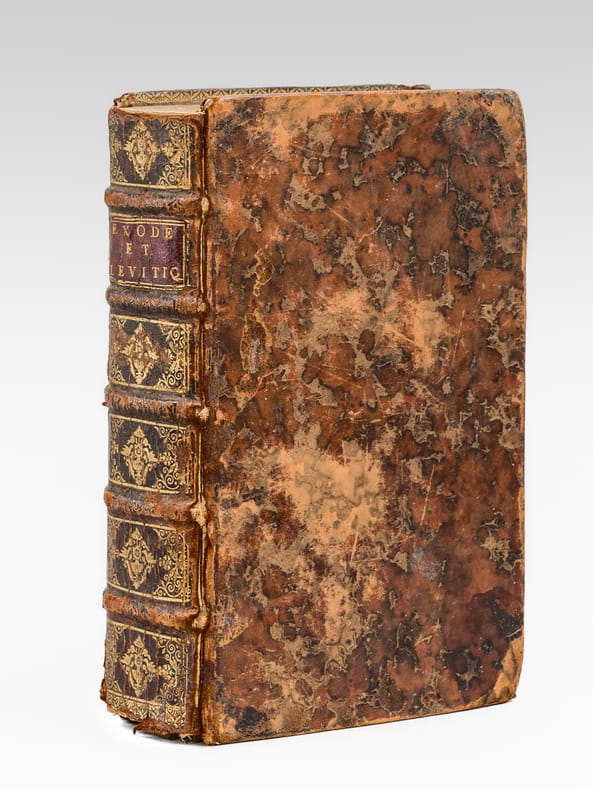 Curieux exemplaire annoté à la plume, probablement dans la seconde partie du XVIIIe siècle, ou sous le Consulat ou l'Empire, par un théiste prônant le libre-examen. On peut par exemple lire en dessous du texte du Chapitre 14 de l'Exode : "L'Histoire d'Hérodote [ ... ] eut laissé une forte impression que les siècles n'auraient pu effacer. L'Egypte alors était florissante [... ] Ou l'exagération est extrême alors Moîse est un menteur ou le fait est faux et il est alors un imposteur". Etat très satisfaisant (petits mq. en coiffe, gommette de papier au dos en queue, bon état par ailleurs) pour ce curieux exemplaire enrichi de nombreuses annotations du temps. Voir également dans notre catalogue d'autres volumes de cette Bible de Sacy en 32 volumes, enrichis des notes manuscrites du même annotateur, qui semble fort intéressé par les civilisations de l'Asie.