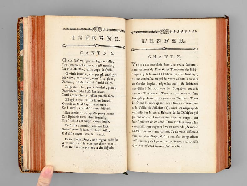 Rare exemplaire de cette édition proposant l'un des toutes premières traduction française en prose de l'Enfer de Dante. Etat satisfaisant (forte mouillure en queue avec mq. de cuir en dos et plats, bon état par ailleurs). Prix en l'état