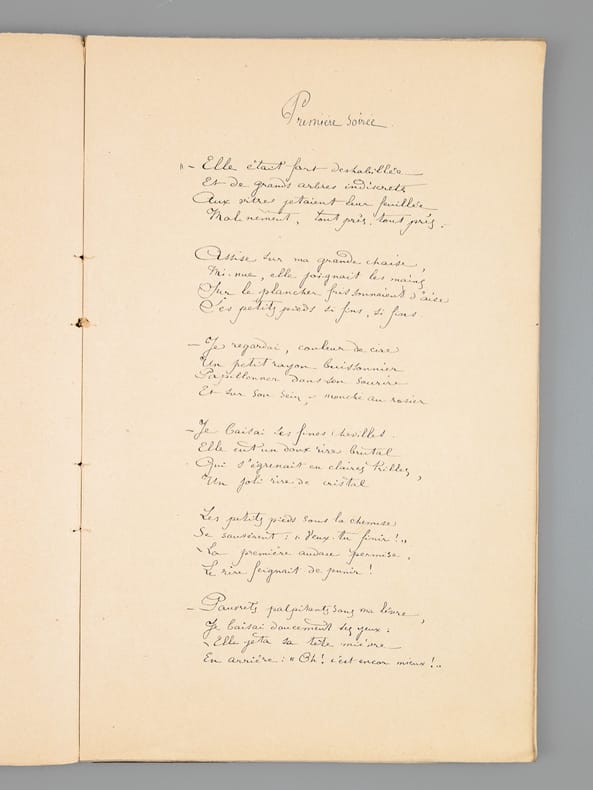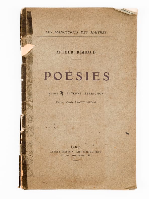 Paris, Messein, Paris, Messein1919 ; petit in-folio, cartonnage bradel crème, pièce de titre maroq. noir en long, non rogné, couverture grise imprimée. 57 ff. - Portrait hors-texte de Rimbaud d’après Fantin-Latour, tiré sur chine.ÉDITION EN PARTIE ORIGINALE de 41 poèmes publiés en fac-similé des manuscrits autographes de Rimbaud. “Ceux-ci, révélateurs à plusieurs titres - classement, corrections, graphies, signatures et dates, fragments inédits... - provenaient des collections Pierre Dauze, Jean Richepin et Louis Barthou (...) Les variations graphiques qui chez Rimbaud évoluent rapidement permettent aussi d’affiner les datations. Dans sa notice, Paterne Berrichon dit sans rire que les poésies reproduites sont “de toutes les époques de sa vie littéraire” (c’est-à-dire de la quinzième à la vingtième année de Rimbaud) et il les divise en quatre chapitres. Steve Murphy, l’un des plus récents exégètes de Rimbaud, estime que certains poèmes de ce fac-similé ont préalablement subi un toilettage de la part de Berrichon” Christian Galantaris n°286.Tirage limité à 545 exemplaires, un des 520 sur papier vélin ordinaire (n°228). Carteret II, p. 275 - Monda et Montel 62-66.Une note manuscrite indique que les poèmes du chapitre 3 sont des copies de la main de Verlaine.