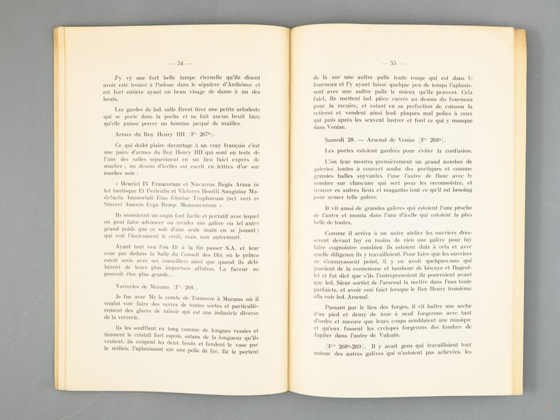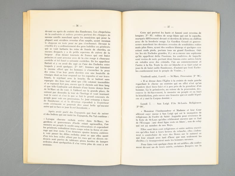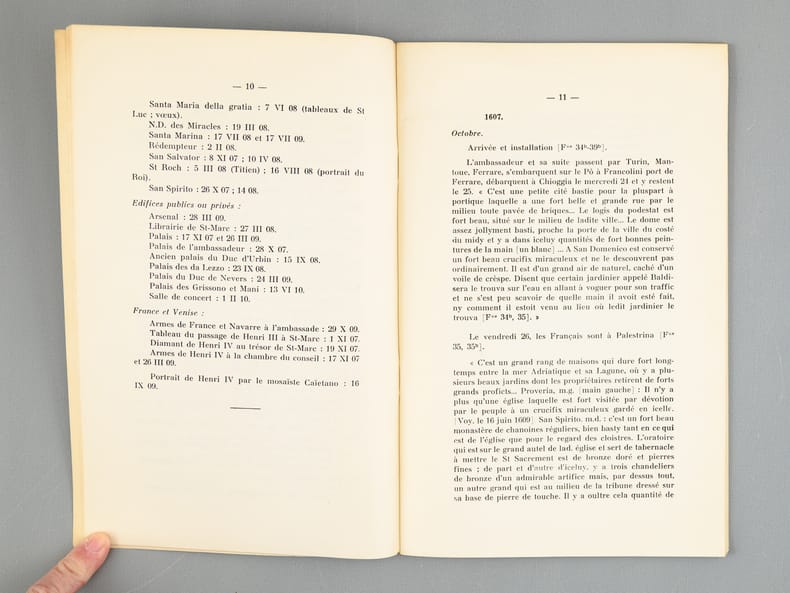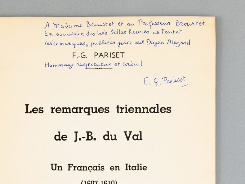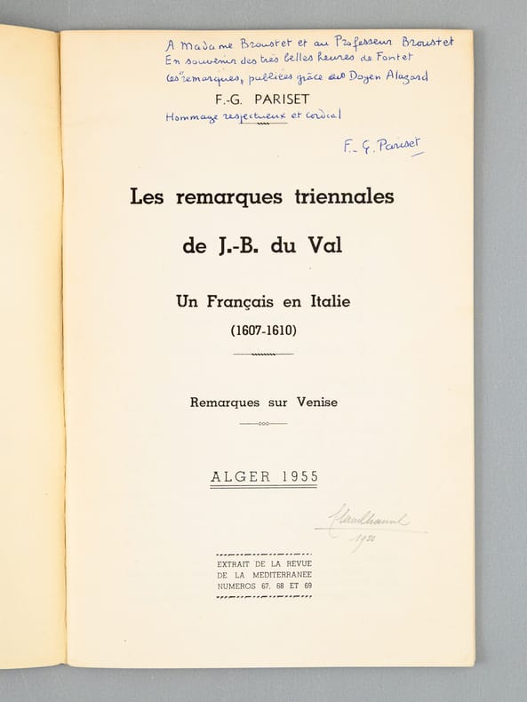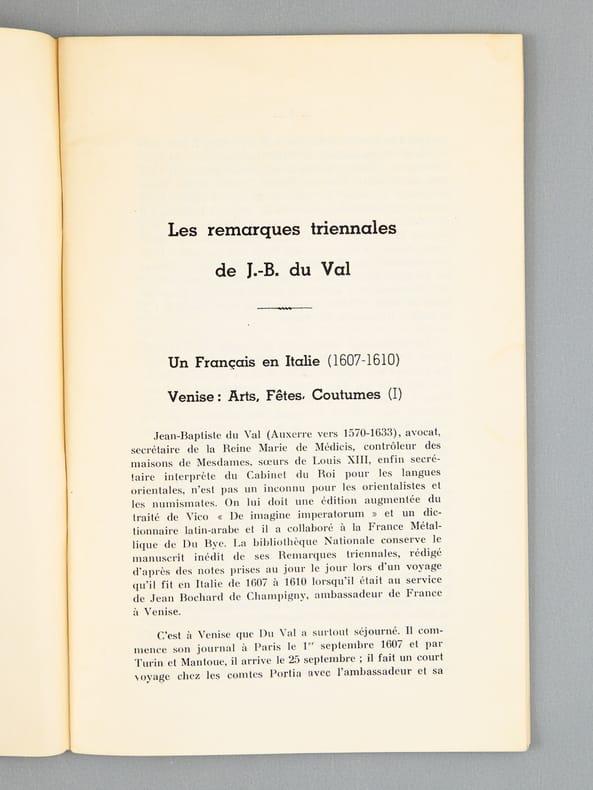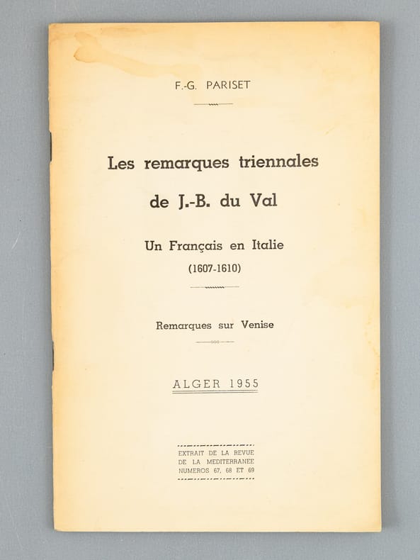 Etat très satisfaisant (ancienne mouill marginale en haut, sans effet sur le texte, bon état par ailleurs). Jean-Baptiste du Val (1570-1633) fut notamment avocat, et secrétaire de la Reine Marie de Médicis. Ses notes de voyages, reprises dans le présent tiré-à-part, proviennent principalement de son séjour à Venise, comme assistant de Jean Bochard de Champigny, ambassadeur de France à Venise. Peu courant.