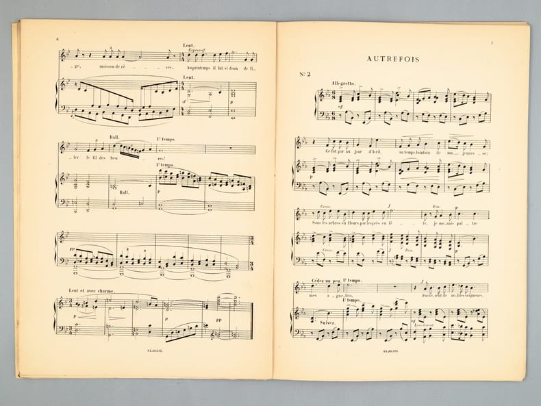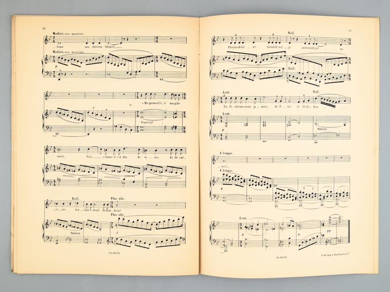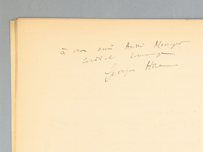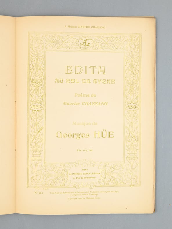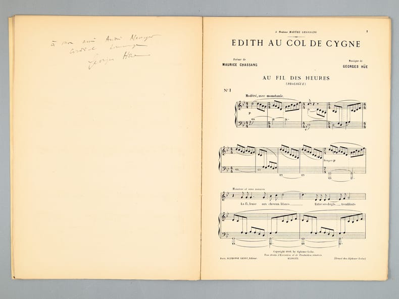 Etat satisfaisant (dos fendu, très bon état par ailleurs) pour cet exemplaire qui mériterait une reliure. L'envoi du compositeur Georges Hüe (1858-1948) est au chef d'orchestre et compositeur André Messager (1853-1929) : "A mon ami André Messager, amical hommage".