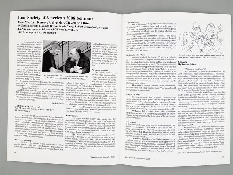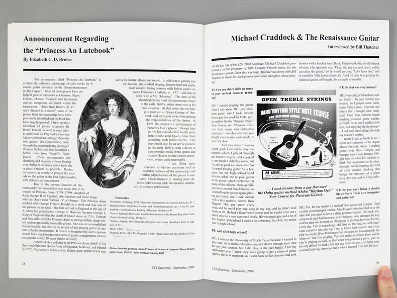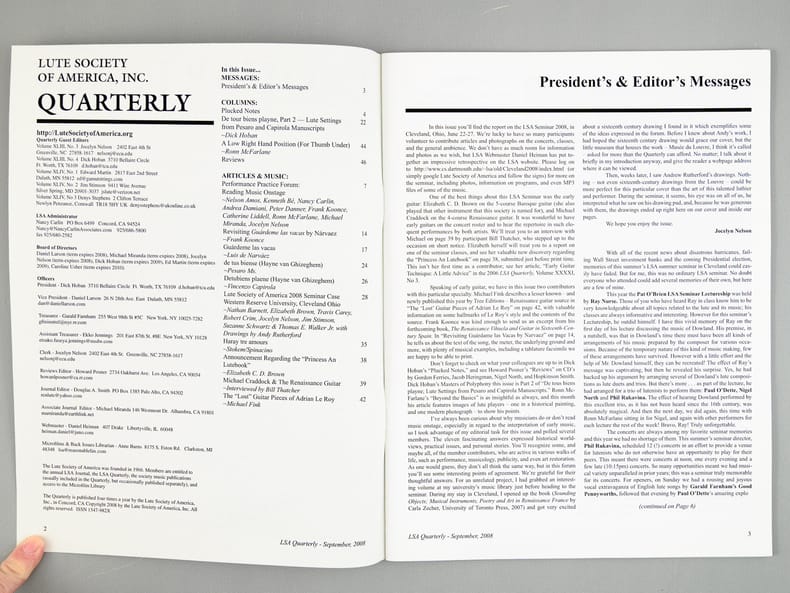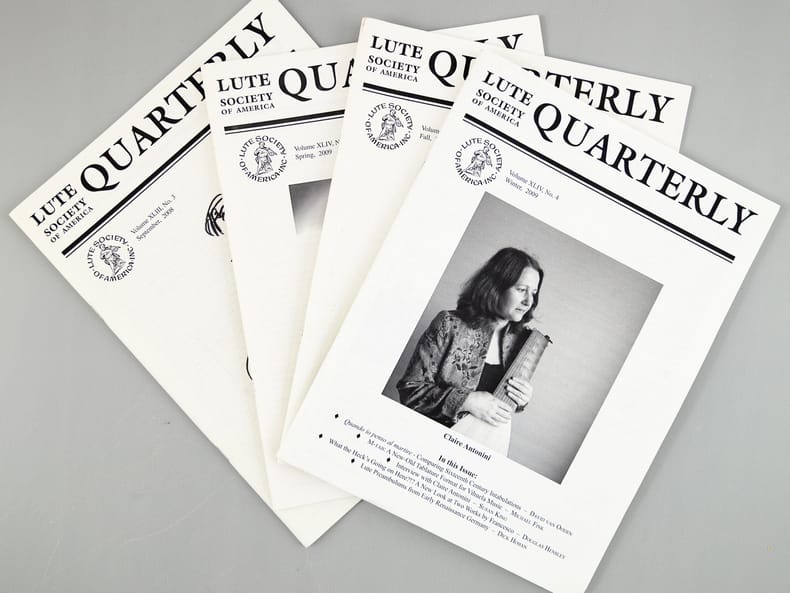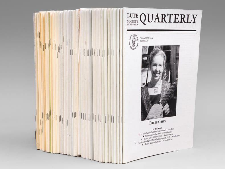 79 vol. 4to., Lute Society of America Quarterly, Lexington Virginia, 1990, 1991, 1992, 1993, 1994, 1995, 1996, 1997, 1998, 1999, 2000, 2001, 2002, 2003, 2004, 2005, 2006, 2007, 2008, 2009, 2010 and 2011, approximately 2,500 pages in total. A very uncommon set of 73 issues of this quarterly journal, from no. XXV/2-3 (May/August 1990) to XLVI/2 (Summer 2011), representing 21 complete years, minus 4 issues. Missing issues are : XXXVI /4, XLI /2, XLIII /4 and XLIV /1. - Ensemble de 73 numéros de cette revue trimestrielle, du n° XXV / 2-3 (Mai/Août 1990) au XLVI / 2 (Eté 2011), soit 21 années complètes, sauf 4 numéros : XXXVI /4, XLI /2, XLIII /4 and XLIV /1 ]
