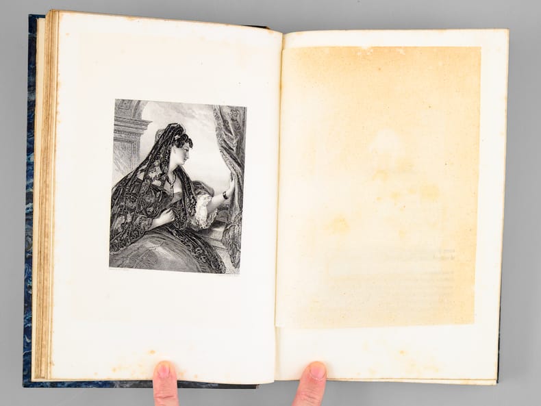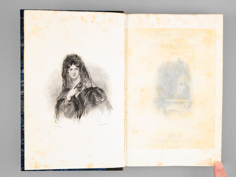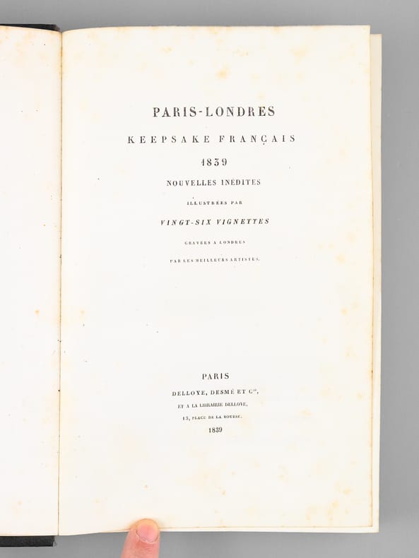 Paris Delloye - Desmé et Compagnie 1839 -in-8 demi-chagrin à coins un volume, reliure demi-chagrin cerise grand in-octavo à coins (full schagreen duodecimo with corners) (25 x 16,5cm), dos 4 nerfs (spine with raised bands), décoré or et à froid (gilt and blind stamping décoration), titre frappé or (gilt title) avec un filet "or" de part et d'autre du titre , filet perlé "or" en place des nerfs avec un filet à froid de part et d'autre des nerfs, entre-nerfs à caissons formé d'un triple filet "or" en encadrement avec rinceaux "or" aux angles, filet "or" et filet perlé "or" en tête et en pied, plats décorés "or" d'un lifet large "or" et d'un filet fin "or" aux mors et aux angles, papier imitation percale "orange" aux plats, toutes tranches lisses, gardes historiées gauffrées et moirées blanches, étiquette EX-LIBRIS aux Armes : Bibliothèque de Mr AFSELIN (au dos de la 1ère de couverture), Orné de 26 jolies vignettes "Romantiques" hors texte (y compris le frontispice et le titre-frontispice) "gravées sur acier à Londres par les meilleurs artistes", 238 pages, 1839 à Paris Delloye - Desmé et Compagnie et à la Librairie Delloye Editeurs,
