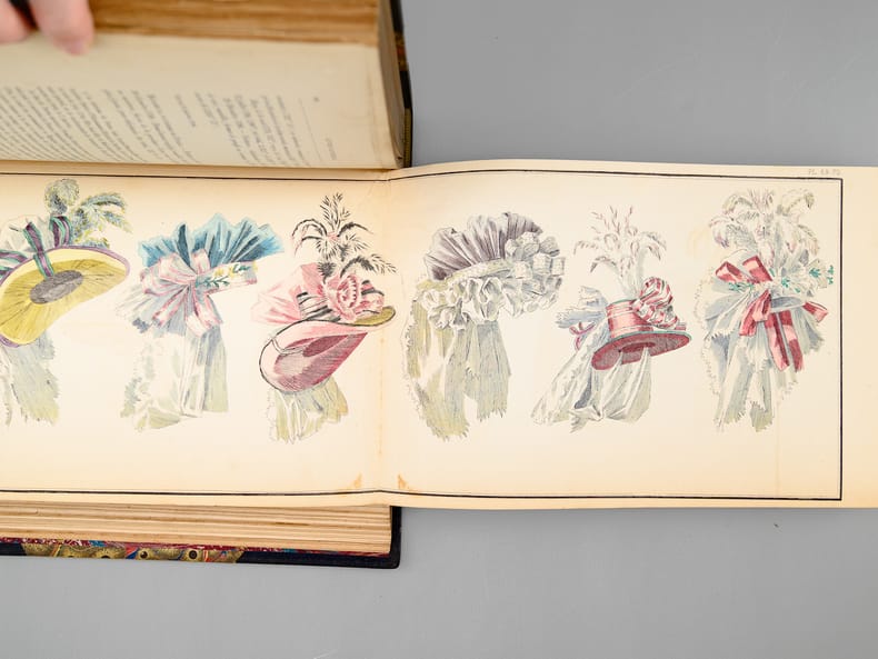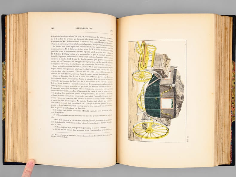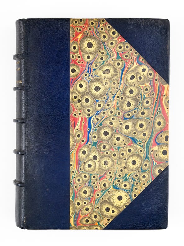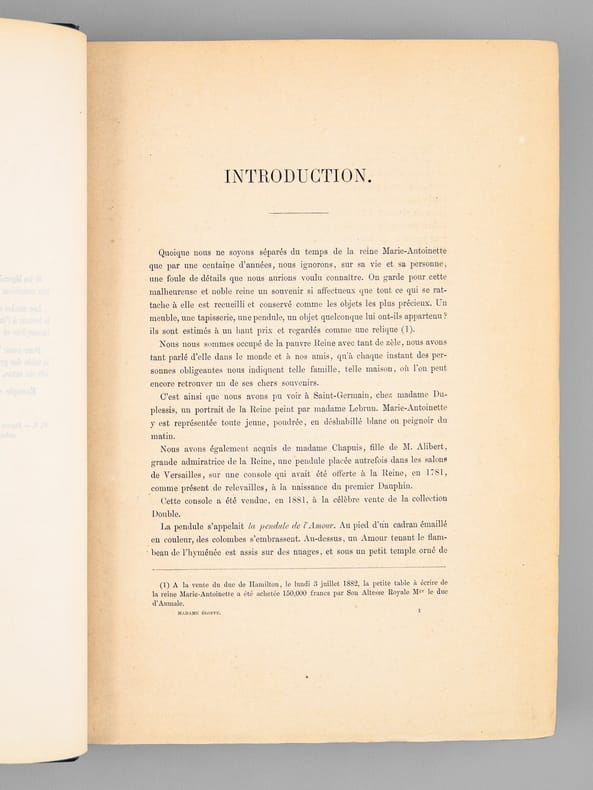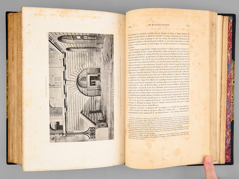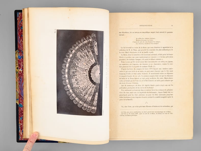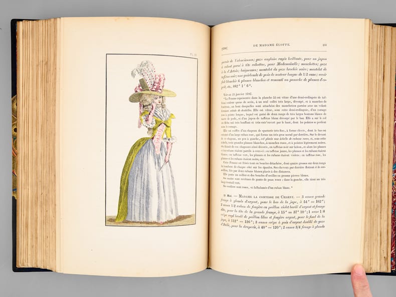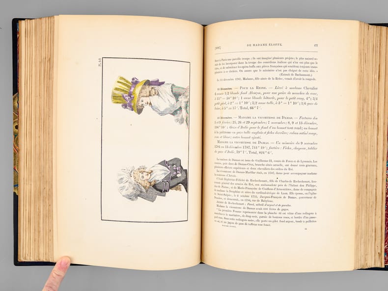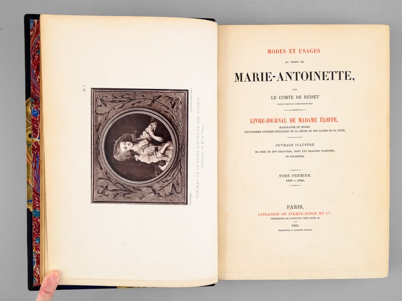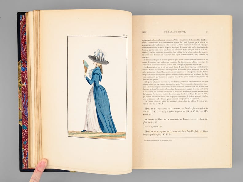 Le grand collectionneur que fut le comte Gustave de Reiset publie ici le Journal de Madame Eloffe, qu'il présente comme "la grande couturière de la Reine, des princesses, des maréchales, des duchesses et des riches bourgeoises du temps. On y trouve de très curieux détails sur les costumes de la fin du règne de Louis XVI". L'ouvrage fournit non seulement le détail de" tous les objets qui formaient à cette époque une toilette de cour", et celui des étoffes et de tous les accessoires, ainsi que leur prix. Si Madame Eloffe n'était en fait qu'une employée de Mme Pompey, fournisseur de la Reine et des princesses, son journal n'en reste pas moins une source essentielle pour l'histoire de la mode. Bon exemplaire très bien relié par Bretault (infime frott. en dos, qq. rouss., bel état par ailleurs, avec le bel ex-libris de la bibliothèque de Félix Durosier).