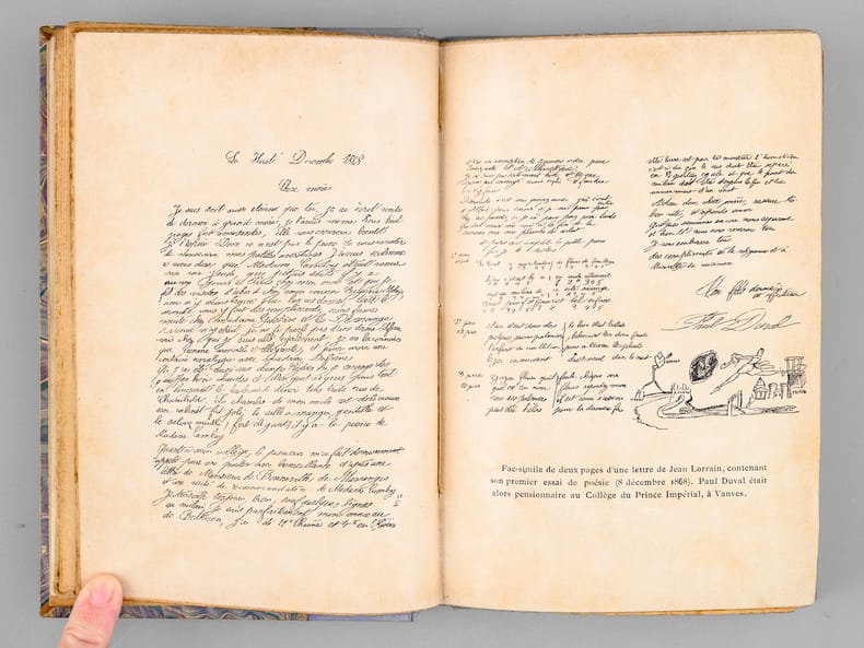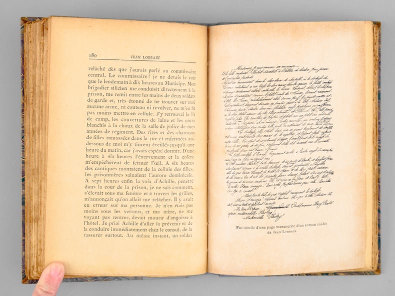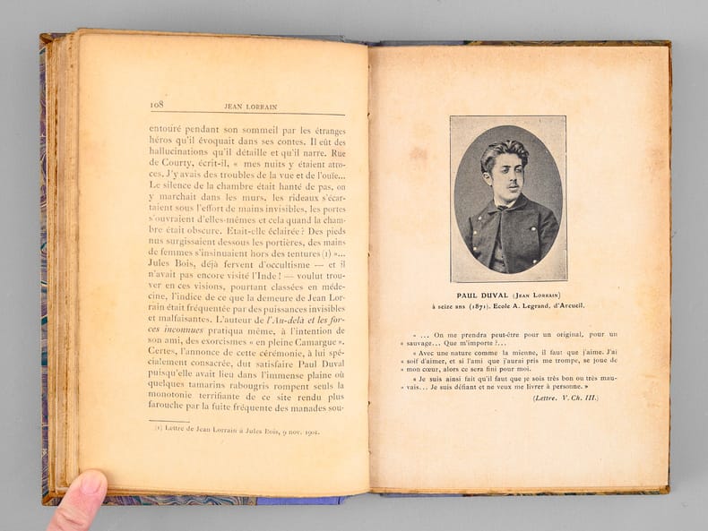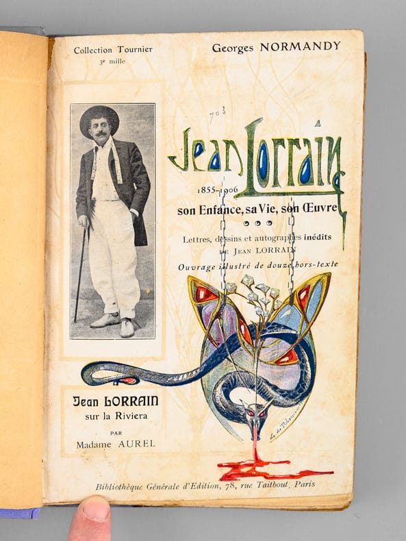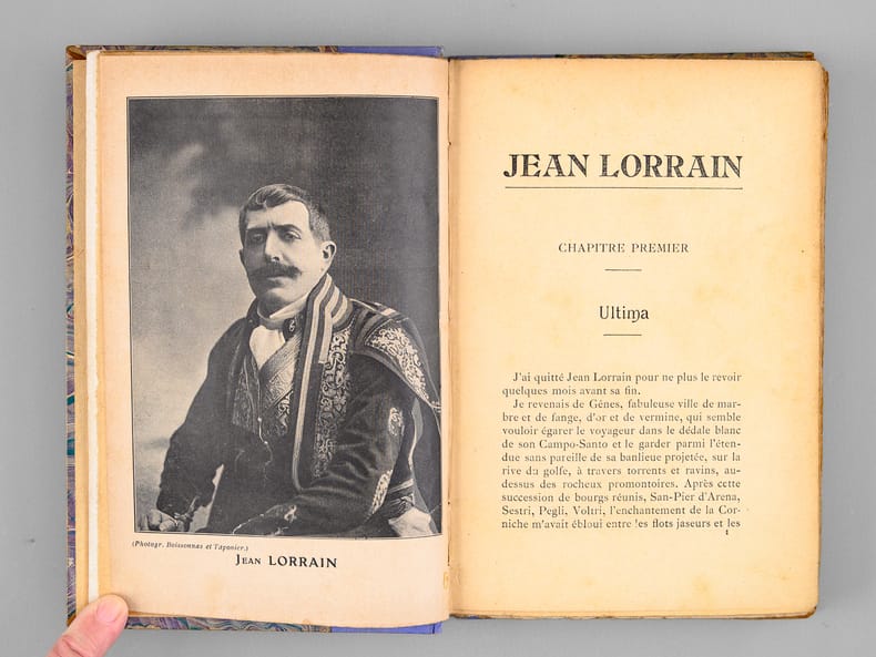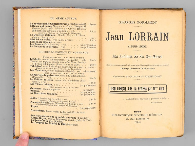 Nombreux documents littéraires, graphiques et iconographiques inédits, Ouvrage illustré de 12 hors-texte, Couverture de Georges de Ribaucourt, Jean Lorrain sur la Riviera par Mme Aurel, mention de 3e mille en couverture conservée, 1 vol. in-12 reliure de l'époque bradel demi-percaline mauve, couvertures conservées, Bibliothèque Générale d'Edition, Paris, 1907, 341 pp. et 4 ff. n. ch.