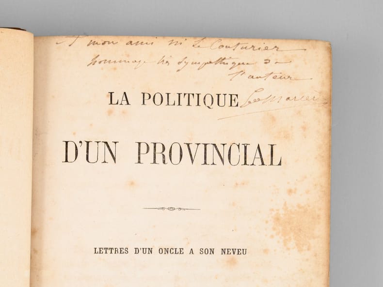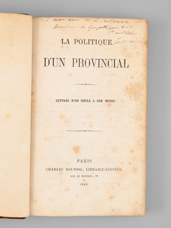 Député du Nord puis du Pas-de-Calais, puis sénateur de 1884 à 1918 (il sera le dernier sénateur inamovible), Emile de Marcère (1828-1918) sera Ministre de l'Intérieur sous 3 gouvernements. Il a dédicacé cet exemplaire "à mon ami Mr le Couturier". Etat très satisfaisant (fente à un mors en tête, reliure un peu frottée, coins frottés, rouss.).