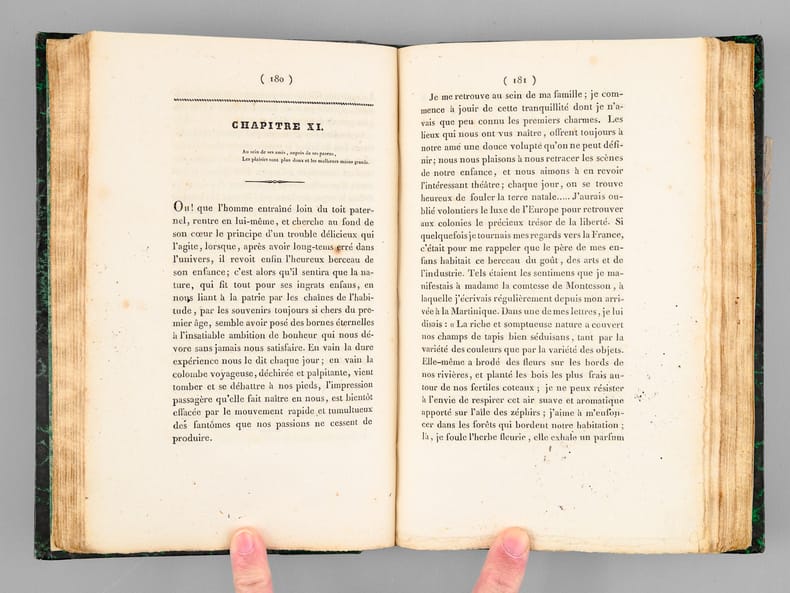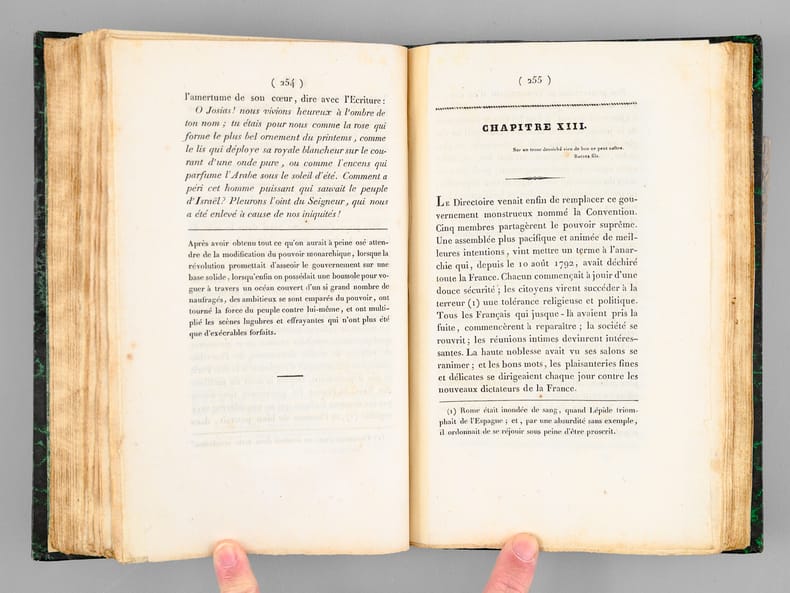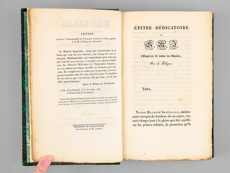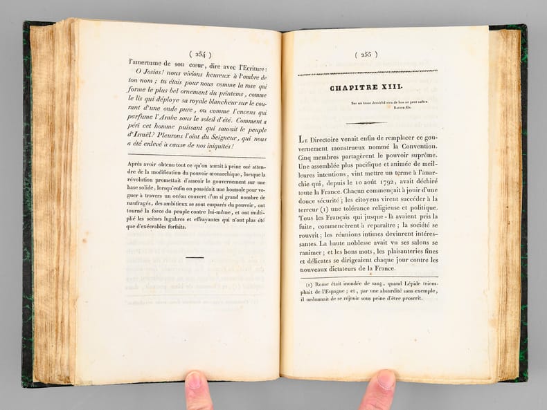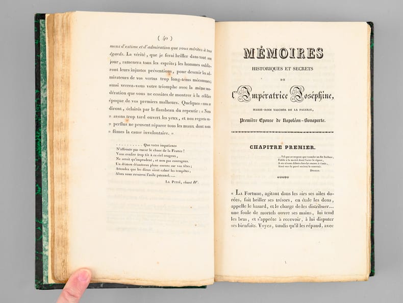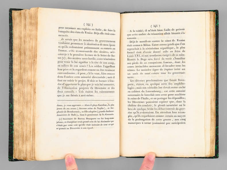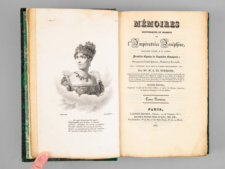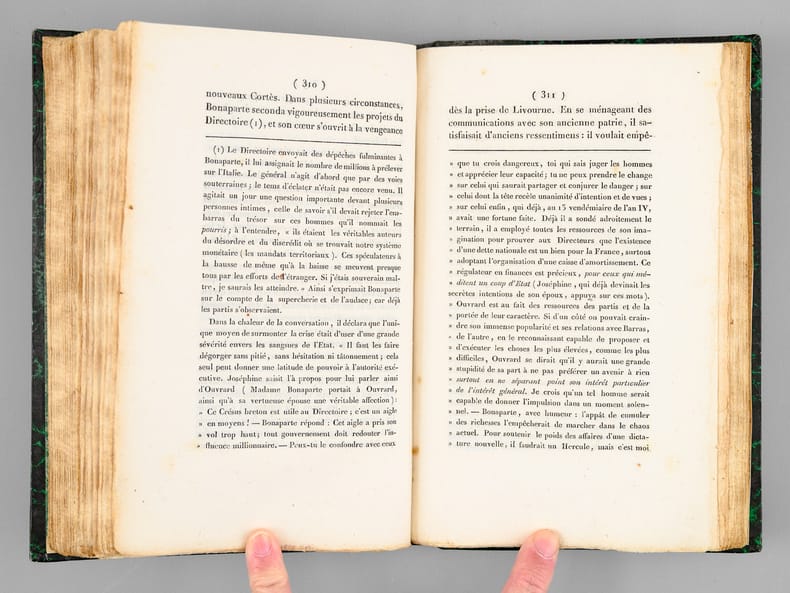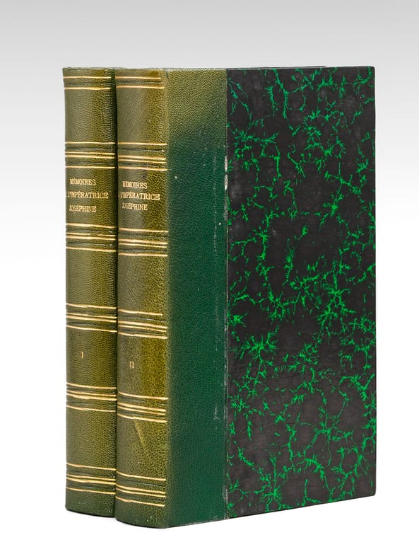 Seconde Edition, augmentée de plus de 300 Notes inédites et suivi des Derniers Souvenirs de Napoléon Bonaparte à l'Ile Sainte-Hélène, 2 vol. in-8 reliure postérieure demi-chagrin vert, couvertures conservées, L'Auteur-Editeur, Dondey-Dupré Père et Fils, Paris, 1827, 462 pp. et 1 f. n. ch., avec portrait en frontispice ; 479 pp. avec portrait en frontispice et 1 fac-similé hors texte
