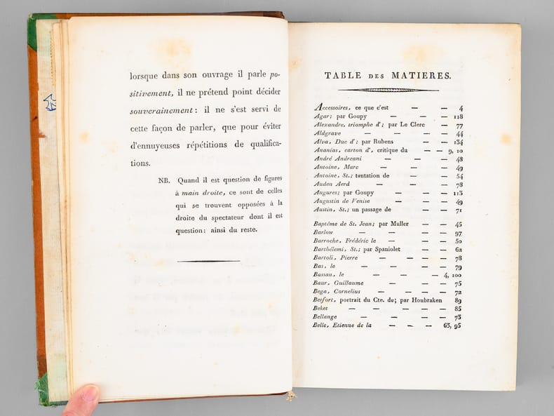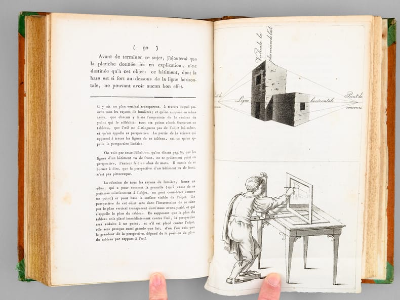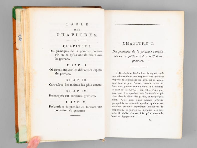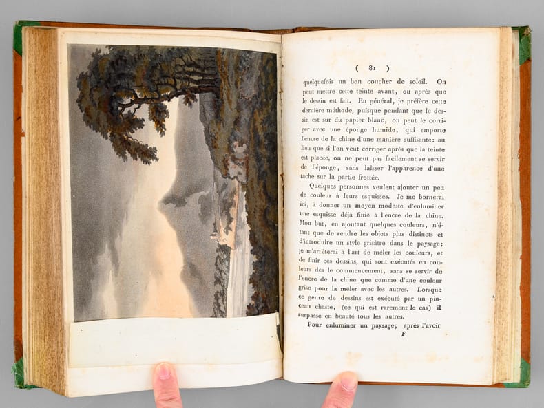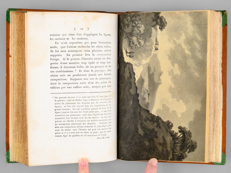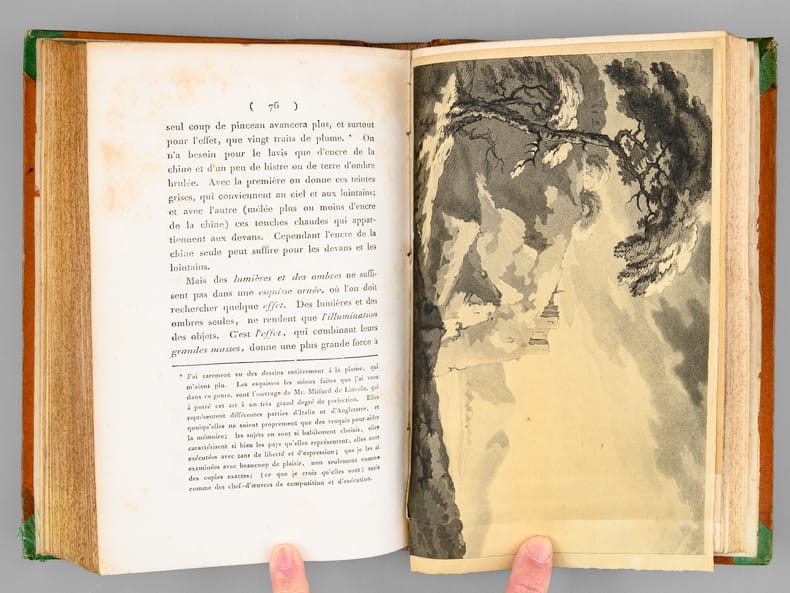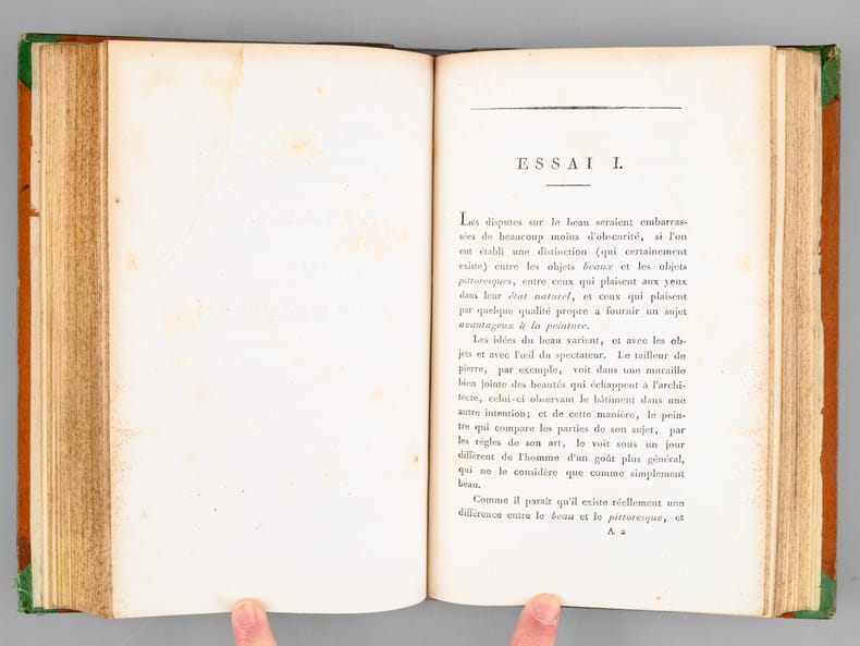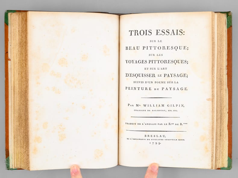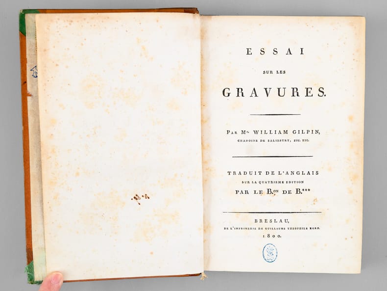 1 vol. in-8 reliure de l'époque demi-basane marron, dos lisse orné, Essai sur les Gravures, traduit de l'anglais sur la Quatrième Edition, par le Bon de B***, De l'Imprimerie de Guillaume Théophile Korn, Breslau, 1800, 9 ff., 167 pp. [Suivi de : ] Trois Essais: Sur le Beau Pittoresque ; sur les Voyages Pittoresques ; et sur l'Art d'Esquisser le Paysage ; suivis d'un Poème sur la Peinture de Paysage. Par Mr William Gilpin, Chanoine de Salisburyn etc. etc. traduit de l'anglais par le Bon de B***, De l'Imprimerie de Guillaume Théophile Korn, Breslau, 1799, 6 ff., 154 pp. et 2 ff., avec 7 planches hors texte (dont 6 dépliantes, l'une en couleurs).