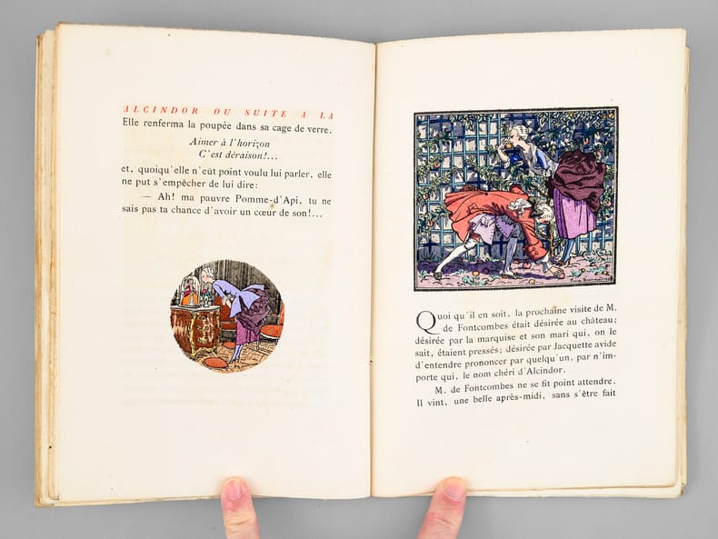 Paris, "Le LIvre", 1920 ; in-8, chagrin grenat janséniste, contreplats ornés sur les trois côtés, d'un double filet encadrant des feuillages reliés par des pointillés, double filet doré sur les coupes, tête dorée, couverture illustrée en couleurs et dos conservés, étui bordé (Kaufmann).