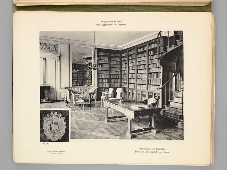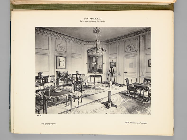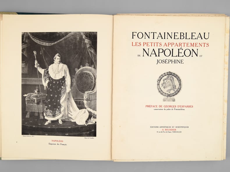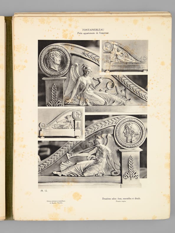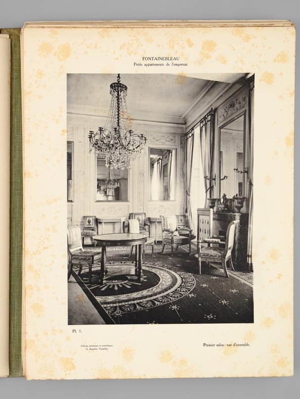 Préface de Georges d'Esparbès, Conservateur du Palais de Fontainebleau, Editions Artistiques et Scientifiques A. Bourdier, Versailles, s.d. [circa 1900 ]18 pp. et 100 planches dont une double (130-131), numéros : ;2;3;4;5;6;7;8;9;10;11;12;13;14;15;17;19;20;22;23;24;25;26;27;28;29;30;32;33;34;36;37;38;39;40;42;43;44;45;46;47;48;49;51;53;54;55;;56;57;59;62;66;69;70;71;72;75;76;79;80;81;82;86;88;91;93;95;96;97;101;103;107;110;118;125;126;127;131;135;138;139;140;141;142;151;152;158;159;161;168;171;179;204;211;215;217;218;220;225