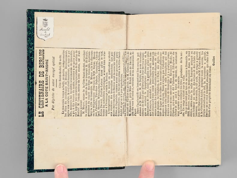Bon état (deux coupures de presses - la première évoquant le centenaire de Berlioz à la Côte-Saint-André - contrecollées en garde, reliure lég. frottée, belle fraîcheur intérieure, ex-libris Mieulet de Lombrail). Polytechnicien, Alexis Jean Armand Mieulet de Lombrail (1828-1904) fut un ardent positiviste et d'un soutien important pour Auguste Comte.